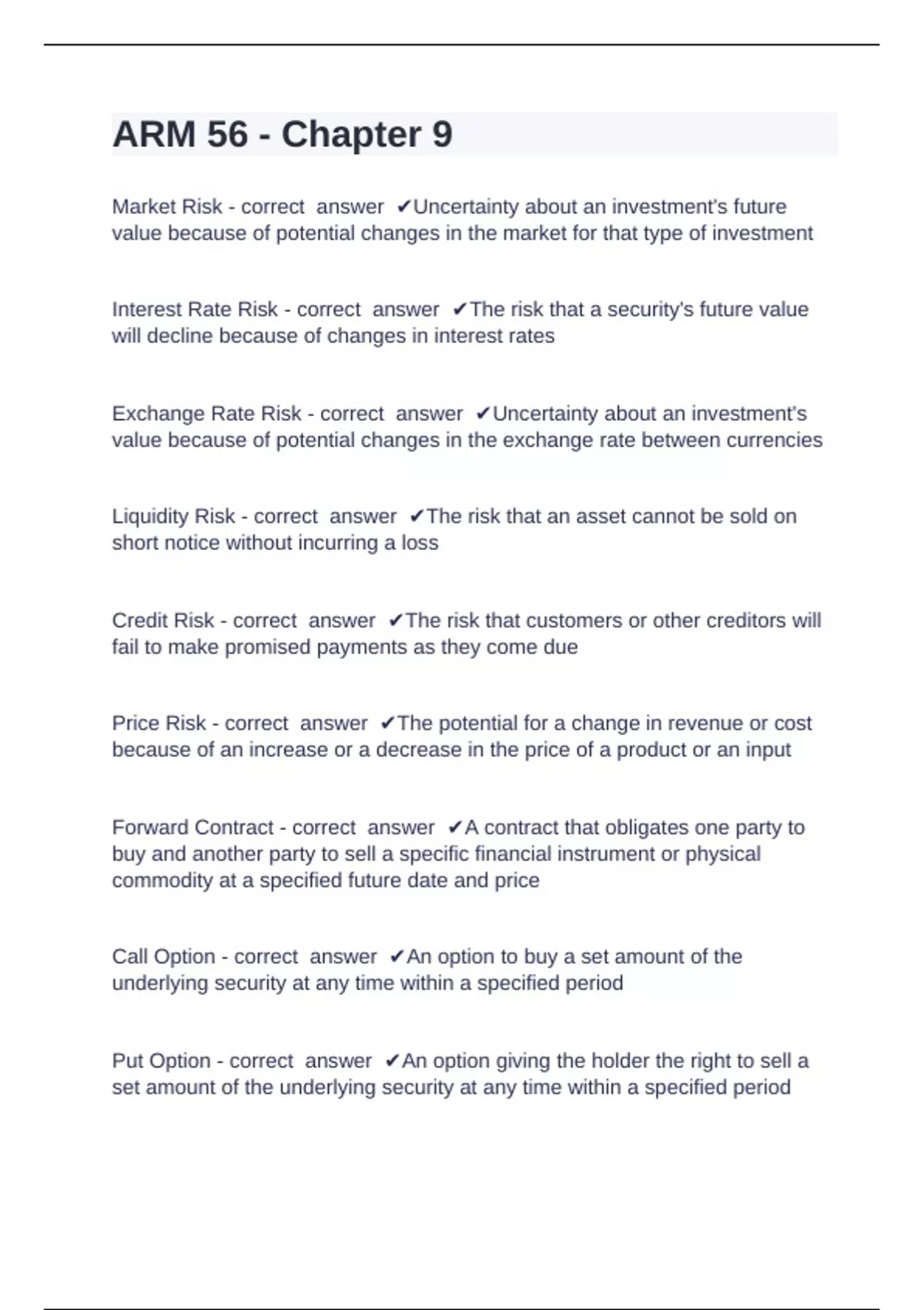 Market Risk - correct answer ✔Uncertainty about an investment's future