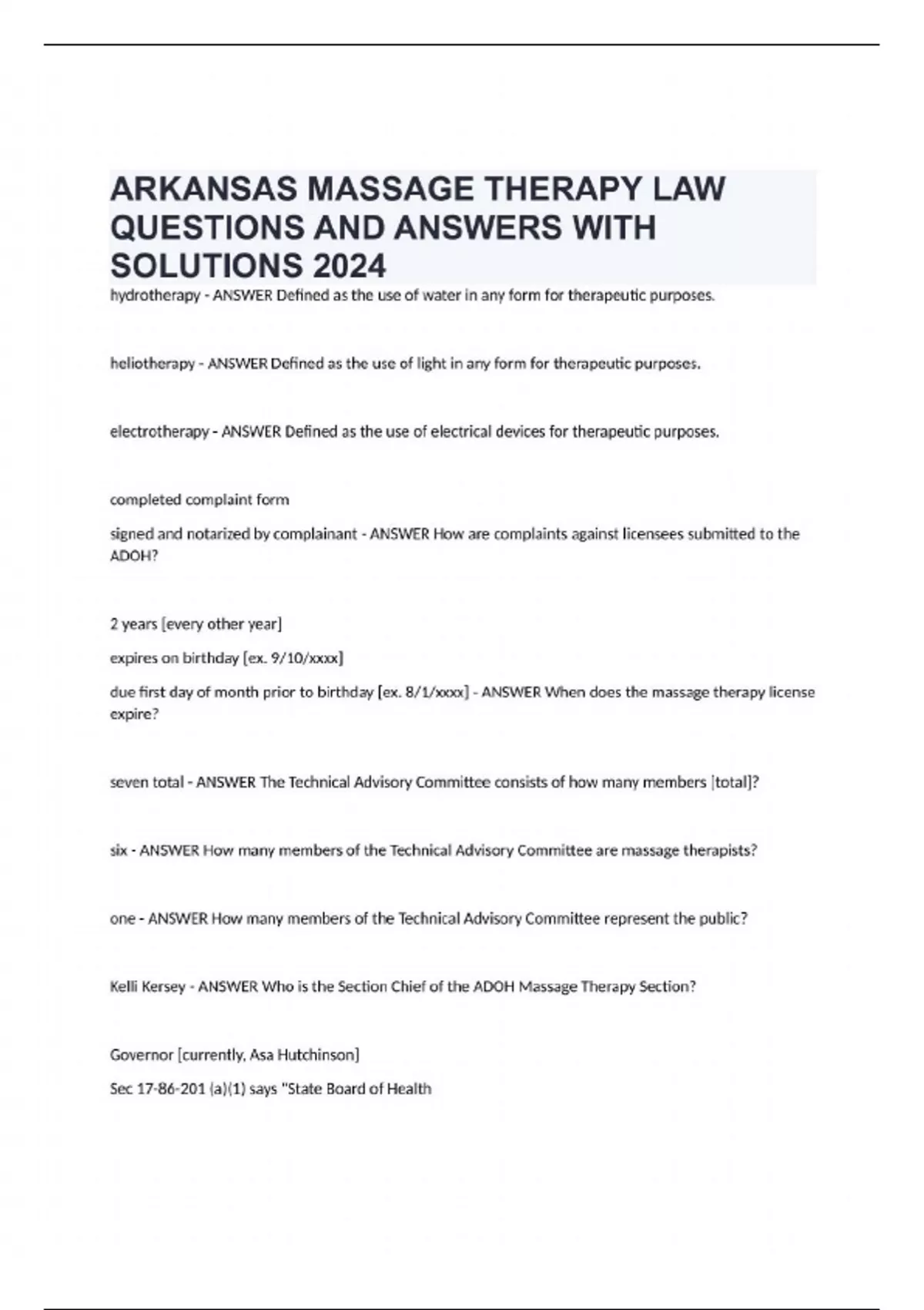 ARKANSAS MASSAGE THERAPY LAW QUESTIONS AND ANSWERS WITH SOLUTIONS 2024
