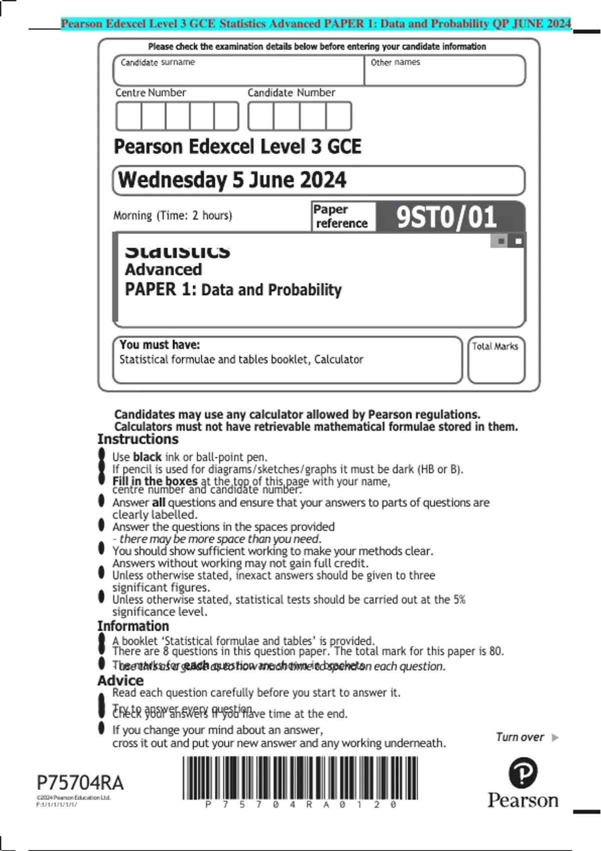 Pearson Edexcel Level 3 GCE Statistics Advanced PAPER 1: Data and Probability QP JUNE 2024
