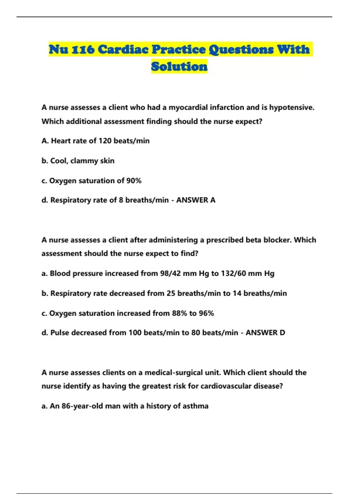 Nu 116 Cardiac Practice Questions With Solution