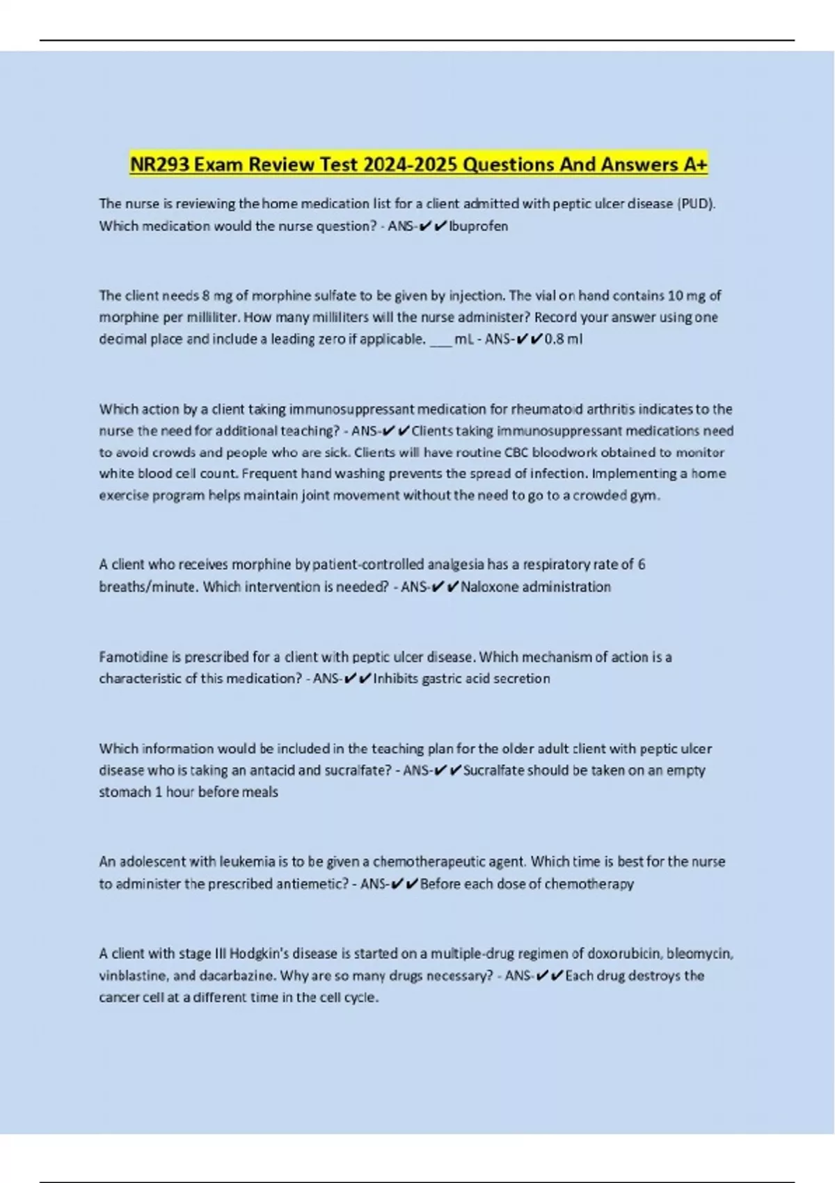 NR293 Exam Review Test Questions And Answers A+ The nurse is reviewing the home medication list for a client admitted with peptic ulcer disease (PUD). Which medication would the nurse question? - ANS-Ibuprofen The client needs 8 mg of morphine sulfate to be given by injection. The vial on hand contains 10 mg of morphine per milliliter. How many milliliters will the nurse administer? Record your answer using one decimal place and include a leading zero if applicable. ___ mL - ANS-0.8 ml Which action by a client taking immunosuppressant medication for rheumatoid arthritis indicates to the nurse the need for additional teaching? - ANS-Clients taking immunosuppressant medications need to avoid crowds and people who are sick. Clients will have routine CBC bloodwork obtained to monitor white blood cell count. Frequent hand washing prevents the spread of infection. Implementing a home exercise program helps maintain joint movement without the need to go to a crowded gym. A client who receives morphine by patient-controlled analgesia has a respiratory rate of 6 breaths/minute. Which intervention is needed? - ANS-Naloxone administration Famotidine is prescribed for a client with peptic ulcer disease. Which mechanism of action is a characteristic of this medication? - ANS-Inhibits gastric acid secretion Which information would be included in the teaching plan for the older adult client with peptic ulcer disease who is taking an antacid and sucralfate? - ANS-Sucralfate should be taken on an empty stomach 1 hour before meals An adolescent with leukemia is to be given a chemotherapeutic agent. Which time is best for the nurse to administer the prescribed antiemetic? - ANS-Before each dose of chemotherapy A client with stage III Hodgkin's disease is started on a multiple-drug regimen of doxorubicin, bleomycin, vinblastine, and dacarbazine. Why are so many drugs necessary? - ANS-...