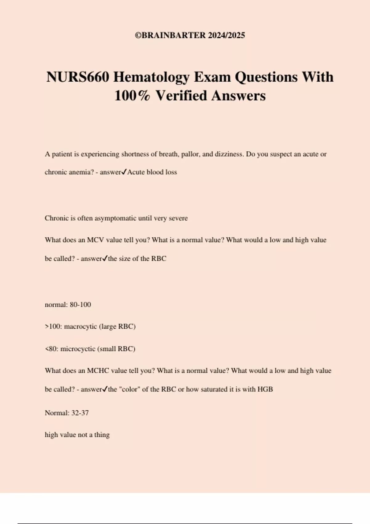 NURS660 Hematology Exam Questions With 100% Verified Answers A patient is experiencing shortness of breath, pallor, and dizziness. Do you suspect an acute or chronic anemia? - answerAcute blood loss Chronic is often asymptomatic until very severe What does an MCV value tell you? What is a normal value? What would a low and high value be called? - answerthe size of the RBC normal: 80-100 >100: macrocytic (large RBC) <80: microcyctic (small RBC) What does an MCHC value tell you? What is a normal value? What would a low and high value be called? - answerthe "color" of the RBC or how saturated it is with HGB Normal: 32-37 high value not a thing ©BRAINBARTER 2024/2025 <32: hypochromic (lacking HGB) What does an RDW value tell you? What is a normal value? What would a low and high value be called? - answeressentially how far apart the RBCs are from each other - the further apart, the less RBCs, otherwise they would be closer just based on the sheer volume ranges about 11-15% but for testing purposes I think it will just say elevated or low Describe in what types of infections/scenarios the types of WBCs would be elevated. Neutrophil Lymphocyte Eosinophils Monocytes Basophils - answerNeutrophil: first line for bacterial infection Lymphocyte: first line for viral infection Eosinophils: allergies, parasitic infections Monocytes: share function with neutrophils, only elevated in SEVERE infections Basophils: parasitic, allergic, inflammation If your CBC comes back abnormal, what is something you can do next? - answeradd on a peripheral smear if you didn't get one already ©BRAINBARTER 2024/2025 Anisocytosis on your peripheral smear is/is not concerning - answernot concerning normal size variant Blasts on your peripheral smear is/is not concerning - answerVery concerning blasts = red flag for leukemia, requires an oncology referral blasts should remain in bone marrow until mature and ready to be released Smudge cells on peripheral smear are seen with - answerCLL What are the two smear cells you may see on a patient with IDA? - answerovalcyte/elliptocyte OR teardrop cells Target cells and basophilic stippling on smears are indicative of... - answerthalassemia Spherocytes on smear may indicate - answerhemolytic anemia What is the most common trigger for the bone marrow to produce more RBCs? - answerdecrease in o2 Name the normal lab values for these labs RBC Hemoglobin Hematocrit - answerRBC: 4.1-5.8 Hgb: 12-16 in women