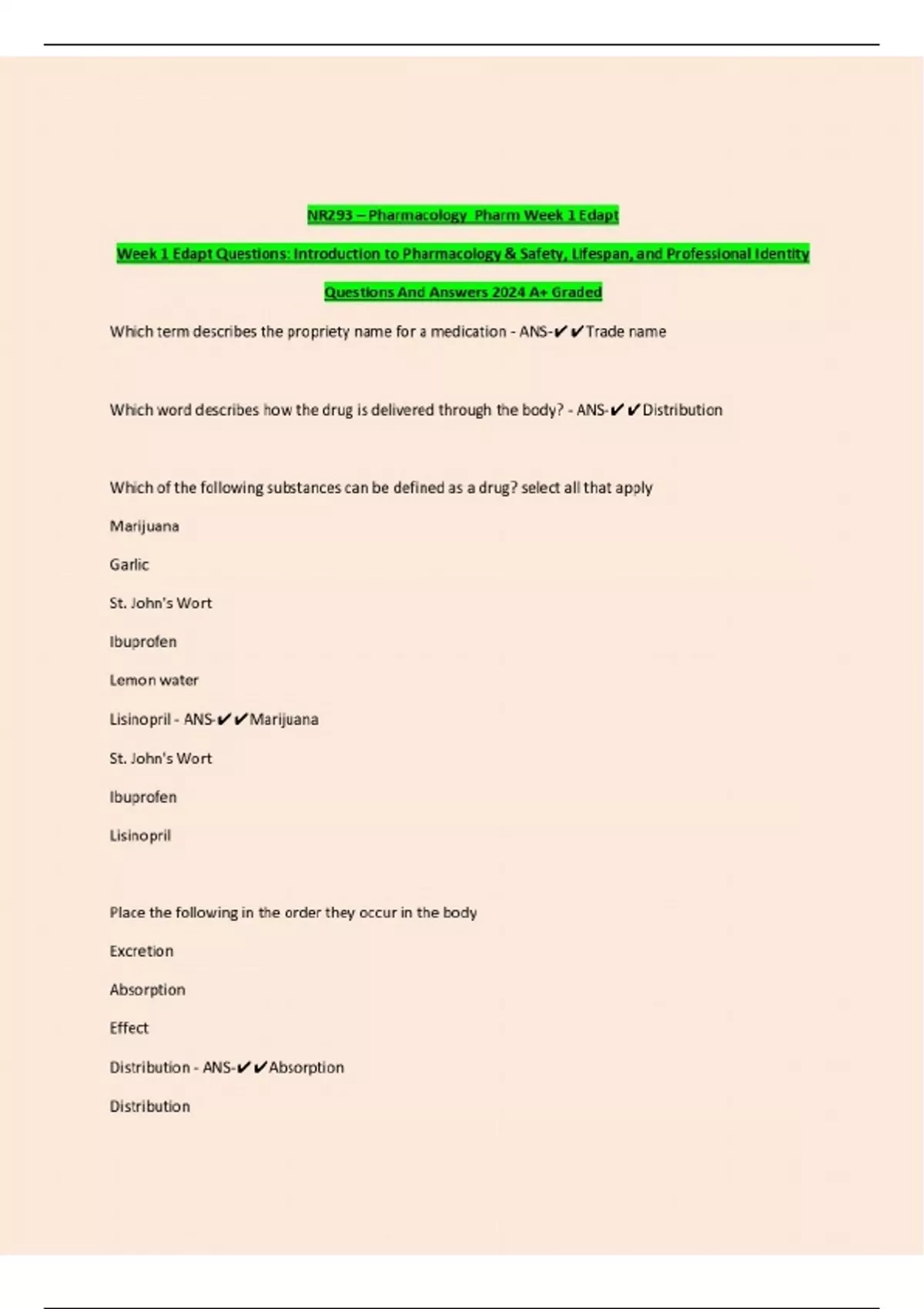 NR293 – Pharmacology Pharm Week 1 Edapt Week 1 Edapt Questions: Introduction to Pharmacology & Safety, Lifespan, and Professional Identity Questions And Answers 2024 A+ Graded Which term describes the propriety name for a medication - ANS-Trade name Which word describes how the drug is delivered through the body? - ANS-Distribution Which of the following substances can be defined as a drug? select all that apply Marijuana Garlic St. John's Wort Ibuprofen Lemon water Lisinopril - ANS-Marijuana St. John's Wort Ibuprofen Lisinopril Place the following in the order they occur in the body Excretion Absorption Effect Distribution - ANS-Absorption Distribution Effect Excretion Chemical name - ANS-Name describing the molecular structure of a drug Generic name - ANS-Name identifying the drug within a class Brand name - ANS-Propriety name used for marketing Which actions may a pharmaceutical company take to create a new drug? - ANS-Change the way a generic medication is absorbed Change the way a generic medication is distributed Combine two medications Create a new medication Name the routes of drug administration - ANS-Ophthalmic: in the eye Otic: in the ear Oral: pills, liquid Topical: delivered directly to an area, usually on the skin Nasal: in the nostrils/ nose Buccal: in the side of the mouth Sublingual: under the tongue Inhalation: breathed into the lungs Intramuscular: in a muscle Intravenous: in a vein Subcutaneous: underneath the skin Rectal: suppositories Phenytoin, an anti-seizure drug can cause drowsiness. Which medication term best describes this occurrence? - ANS-Side effect Bill is looking at a BP medication. The label Basicide 10mg/25mg. Which of the following is accurate? - ANS-.... Continues...