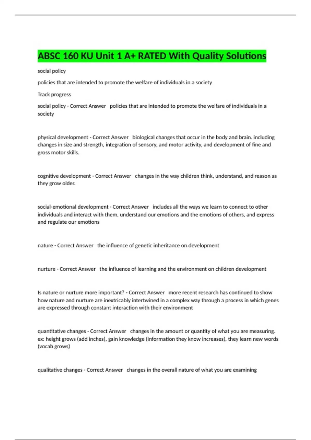 social policy - Correct Answer policies that are intended to promote the welfare of individuals in a