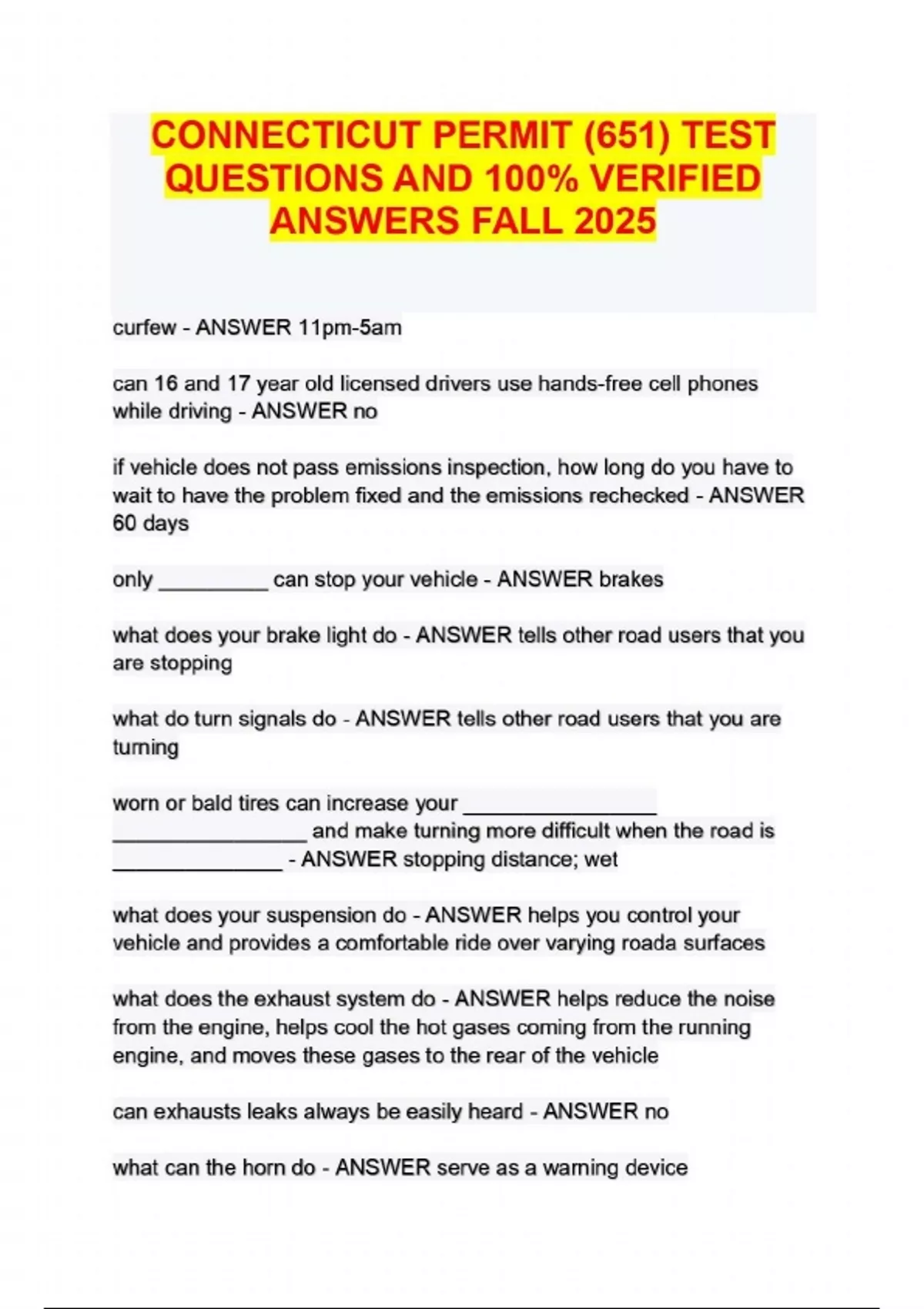 CONNECTICUT PERMIT (651) TEST QUESTIONS AND 100 VERIFIED ANSWERS FALL 2025