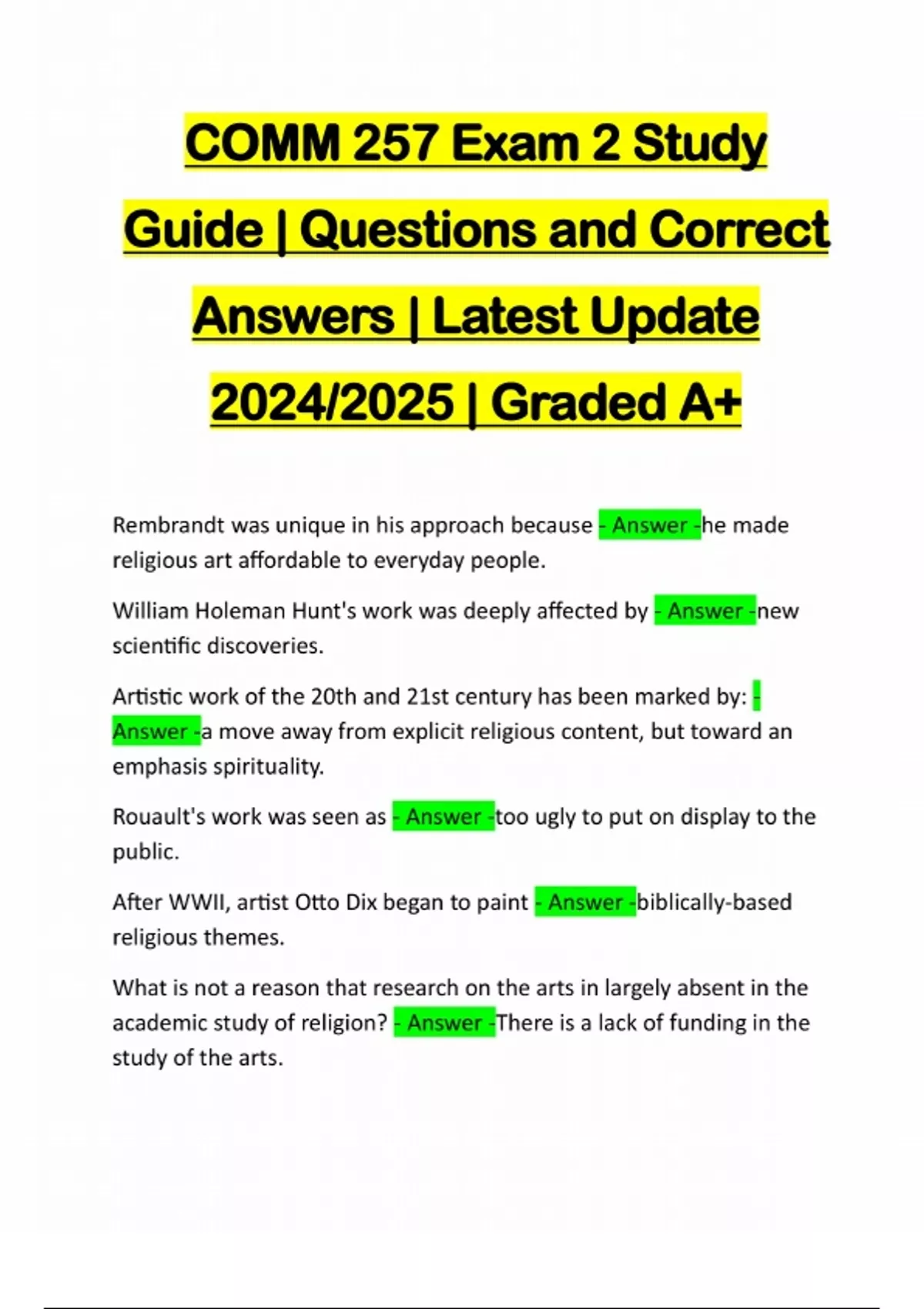 COMM 257 Exam 2 Study Guide | Questions and Correct Answers | Latest Update 2024/2025 | Graded A+ Rembrandt was unique in his approach because - Answer -he made religious art affordable to everyday people. William Holeman Hunt's work was deeply affected by - Answer -new scientific discoveries. Artistic work of the 20th and 21st century has been marked by: - Answer -a move away from explicit religious content, b