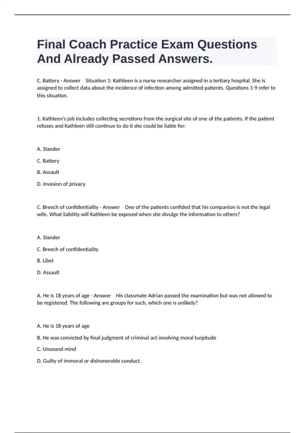 C. Battery - Answer Situation 1: Kathleen is a nurse researcher assigned in a tertiary hospital. She is
