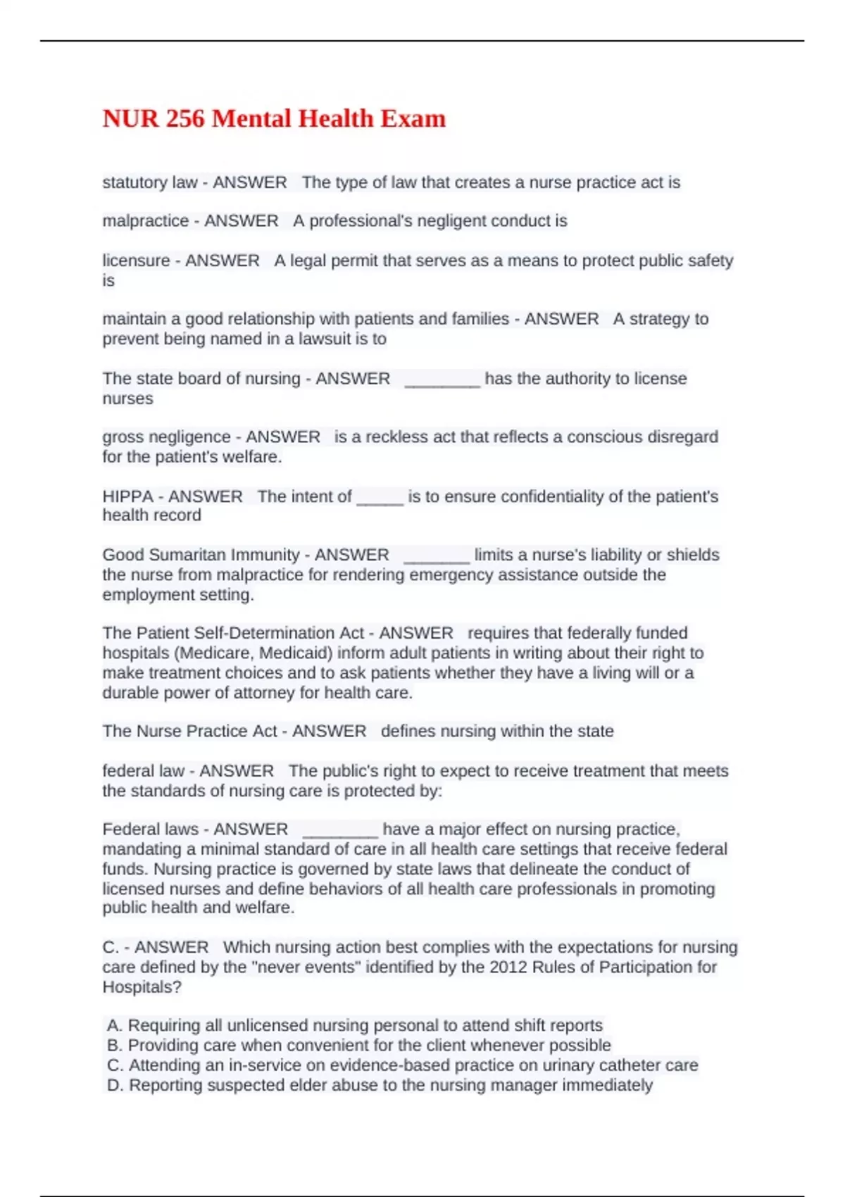 C. - ANSWER Which nursing action best complies with the expectations for nursing