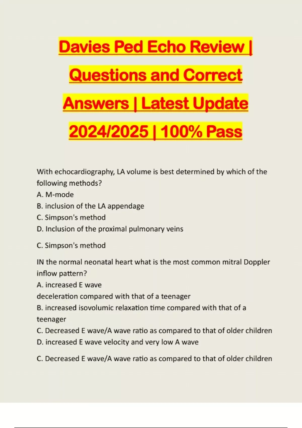 Davies Ped Echo Review | Questions and Correct Answers | Latest Update 2024/2025 | 100% Pass With echocardiography, LA volume is best determined by which of the following methods? A. M-mode B. inclusion of the LA appendage C. Simpson's method D. Inclusion of the proximal pulmonary veins C. Simpson's method IN the normal neonatal heart what is the most common mitral Doppler inflow pattern? A. increased E wave deceleration compared with that of a teenager B. increased isovolumic relaxation time compared with that of a teenager C. Decreased E wave/A wave ratio as compared to that of older children D. increased E wave velocity and very low A wave C. Decreased E wave/A wave ratio as compared to that of older childrenA mitral valve E wave that is decreased in comparison to the A wave most likely represents which of the following? A. Abnormal LV relaxation with normal LA pressure B. Restrictive cardiomyopathy C. Normal finding in the young adult D. Noncompliant LV A. Abnormal LV relaxation with normal LA pre