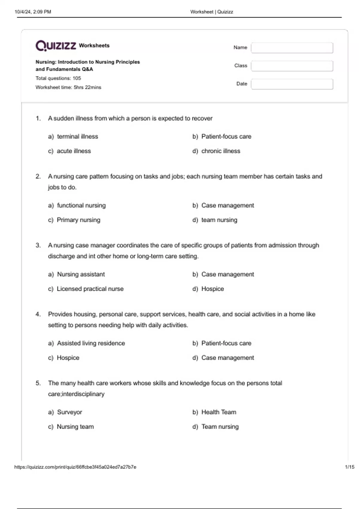 1. A sudden illness from which a person is expected to recover a) terminal illness b) Patient-focus care c) acute illness d) chronic illness 2. A nursing care pattern focusing on tasks and jobs; each nursing team member has certain tasks and jobs to do. a) functional nursing b) Case management c) Primary nursing d) team nursing 3. A nursing case manager coordinates the care of specific groups of patients from admission through discharge and int other home or long-term care setting. a) Nursing assistant b) Case management c) Licensed practical nurse d) Hospice 4. Provides housing, personal care, support services, health care, and social activities in a home like setting to persons needing help with daily activities. a) Assisted living residence b) Patient-focus care c) Hospice d) Case management 5. The many health care workers whose skills and knowledge focus on the persons total care;interdisciplinary a) Surveyor b) Health Team c) Nursing team d) Team nursing 10/4/24, 2:09 PM Worksheet | Quizizz 10/4/24, 2:09 PM Worksheet | Quizizz 6. A person who performs delegated nursing tasks under the supervision of an RN or LPN/LVN a) Licensed Practical Nurse c) Registered Nurse b) Nursing Assistant d) Licensed Vocational Nurse 7. a nursing care pattern where the RN is responsible for the person's total care a) Licensed Practical Nurse c) Primary nursing b) Patient focus-care d) Team nursing 8. A nursing care pattern in which is a team nursing staff is led by an RN who decides the amount and kind of care each person needs. a) Hospice b) Primary Nursing c) Nusing Team d) Team Nursing 9. An ilness or injury from which the person wil not likely recover. a) Acute ilness c) broken leg b) Terminal Ilness d) Chronic ilness 10. A person who colects information by observing and asking questions. a) Surveyor c) Patient-focus Care b) Case Management d) Licensed Practical Nurse 11. A nurse who has completed a 2-3-, or 4 year nursing program and has passed a licensed test. a) Registered Nurse c) Nursing assistant b) Licensed Practical Nurse d) Physician 12. A health care agency or program for persons who are dying. a) Case Management c) Hospice b) Patient-focus Care d) Assisted living Residence 2/15 10/4/24, 2:09 PM Worksheet | Quizizz 13. An ongoing ilness that is slow or gradual in onset; it has no known cure;it can be controled and complications prevented with proper treatment a) Chronic ilness b) The flu c) acute ilness 14. LPN's are sometimes caled a) Doctors c) Registered Nurse d) Patient-focus care b) Licensed vocational Nurse d) Functional nursing 15. A nurse who has completed a practical nursing program and has passed a licensed test a) Nursing Assistant c) Licensed Practical Nurse b) Licensed vocational Nurse d) Registered Nurse 16. When services are moved from departments to the bedside, this is a nursing care pattern. a) Assisted living residence c) Hospice b) Case Management d) Patient-focused care 17. These are organized bodies of knowledge to define what nursing is, what nurses do, and why do they do it. Ans. 18. Provide a way to define nursing as a unique discipline that is separate from other disciplines. Ans. 19. It is a framework of concepts and purposes intended to guide the practice of nursing at a concrete and specific level. Ans. 20. Curriculum Era Ans. 3/15