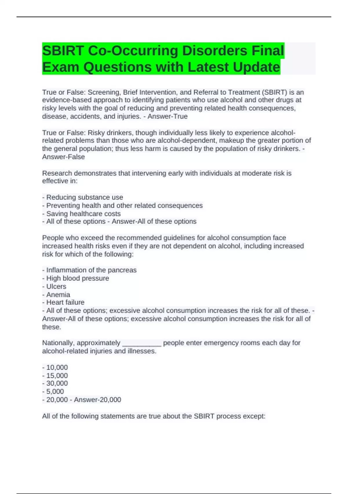 True or False: Screening, Brief Intervention, and Referral to Treatment (SBIRT) is an evidence-based approach to identifying patients who use alcohol and other drugs at risky levels with the goal of reducing and preventing related health consequences, disease, accidents, and injuries. - Answer-True True or False: Risky drinkers, though individually less likely to experience alcohol-related problems than those who are alcohol-dependent, makeup the greater portion of the general population; thus less harm is caused by the population of risky drinkers. - Answer-False Research demonstrates that intervening early with individuals at moderate risk is effective in: - Reducing substance use - Preventing health and other related consequences - Saving healthcare costs - All of these options - Answer-All of these options People who exceed the recommended guidelines for alcohol consumption face increased health risks even if they are not dependent on alcohol, including increased risk for which of the following: - Inflammation of the pancreas - High blood pressure - Ulcers - Anemia - Heart failure - All of these options; excessive alcohol consumption increases the risk for all of these. - Answer-All of these options; excessive alcohol consumption increases the risk for all of these. Nationally, approximately __________ people enter emergency rooms each day for alcohol-related injuries and illnesses. - 10,000 - 15,000 - 30,000 - 5,000 - 20,000 - Answer-20,000 All of the following statements are true about the SBIRT process except: