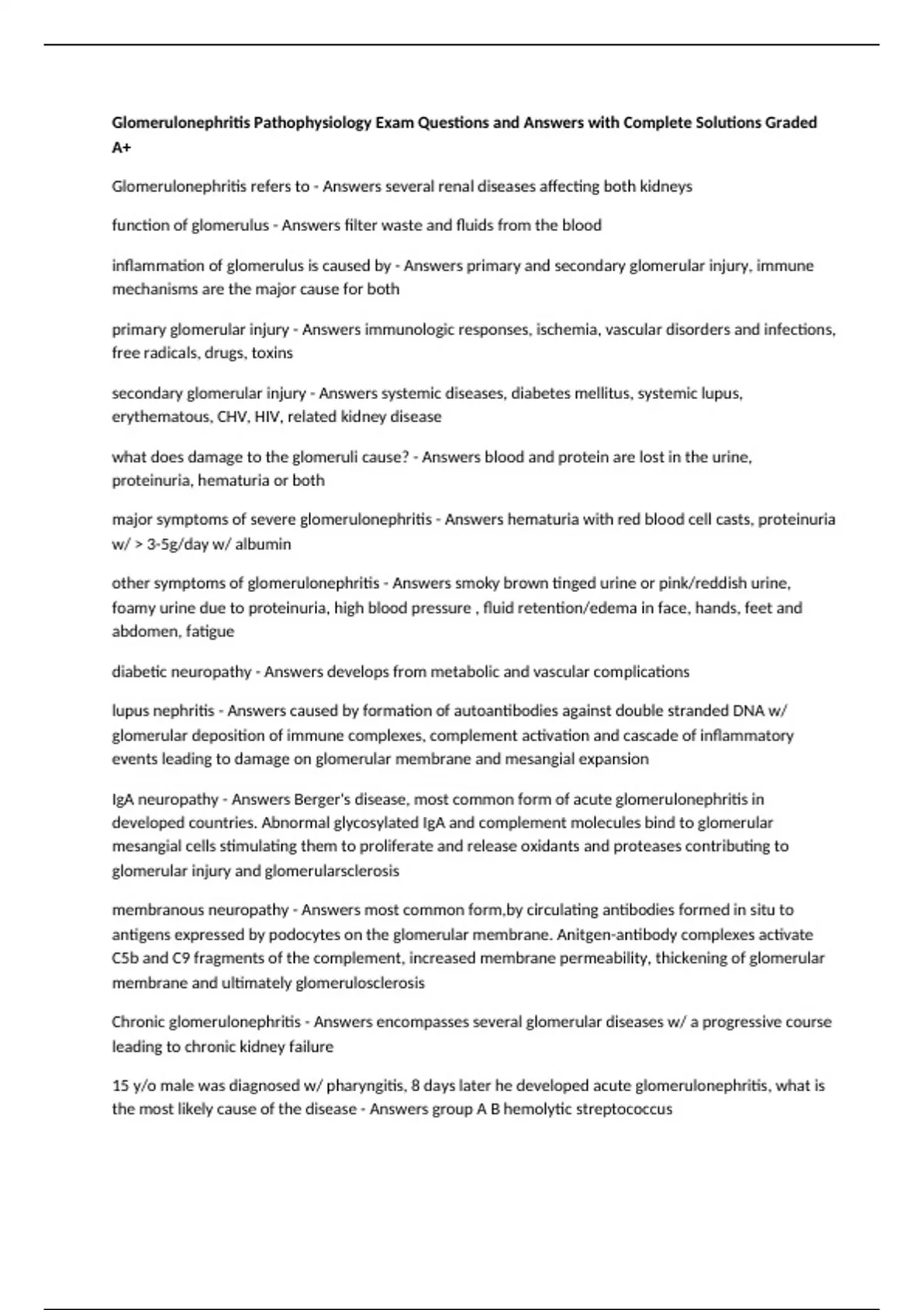 Glomerulonephritis Pathophysiology Exam Questions and Answers with Complete Solutions Graded