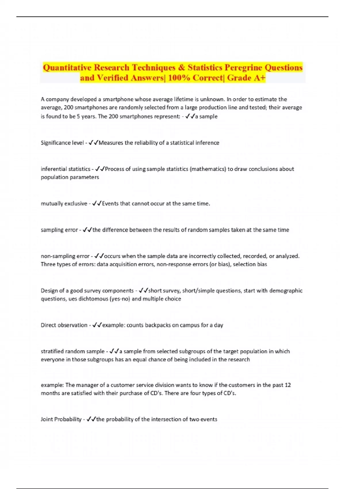 Quantitative Research Techniques & Statistics Peregrine Questions and Verified Answers| 100% Correct| Grade A+