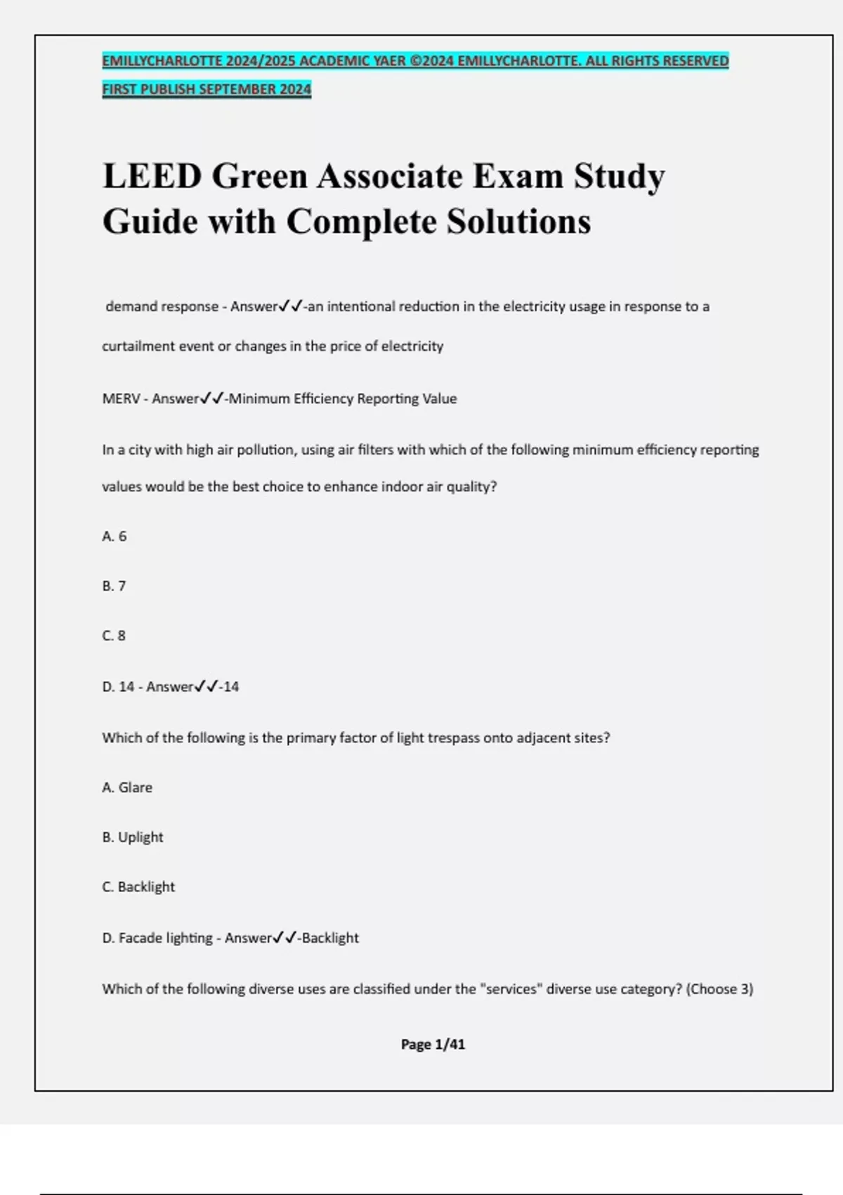 LEED Green Associate Exam Study Guide with Complete Solutions demand response - Answer-an intentional reduction in the electricity usage in response to a curtailment event or changes in the price of electricity MERV - Answer-Minimum Efficiency Reporting Value In a city with high air pollution, using air filters with which of the following minimum efficiency reporting values would be the best choice to enhance indoor air quality? A. 6 B. 7 C. 8 D. 14 - Answer-14 Which of the following is the primary factor of light trespass onto adjacent sites? A. Glare B. Uplight C. Backlight D. Facade lighting - Answer-Backlight Which of the following diverse uses are classified under the "services" diverse use category? (Choose 3) EMILLYCHARLOTTE 2024/2025 ACADEMIC YAER ©2024 EMILLYCHARLOTTE. ALL RIGHTS RESERVED FIRST PUBLISH SEPTEMBER 2024 Page 2/41 A. Dry cleaner B. Education center C. Bank D. Pharmacy E. Restaurant - Answer-Dry Cleaner, Bank, Restaurant For the LEED for Homes certification, at the beginning of the project, project teams will need to hire a __________, which will be responsible for overseeing all the certification process and incorporate the rating system requirements into the project's design and construction. A. Legacy LEED AP B. LEED for Homes Provider Organization C. LEED AP Homes D. LEED Pro Reviewer - Answer-D. LEED for Homes Provider Organization LEED Pro Reviewer - Answer-professionals that evaluate the educational LEED courses on EDUCATION@USGBC. Legacy LEED AP - Answer-professionals who passed the LEED AP exam before 2009; not offered anymore and all new LEED APs should choose a specialty In LEED, which of the following standards is used for fundamental commissioning? A. ASHRAE Standard 52.2-2007 B. ASHRAE Standard 55-2010 EMILLYCHARLOTTE 2024/2025 ACADEMIC YAER ©2024 EMILLYCHARLOTTE. ALL RIGHTS RESERVED FIRST PUBLISH SEPTEMBER 2024 Page 3/41 C. ASHRAE Standard 90.1 D. ASHRAE Guideline 0-2005 - Answer-D. ASHRAE Guideline 0-2005 ASHRAE Guideline 0-2005 - Answer-Commissioning essentials ASHRAE Guideline 1.1-2007 - Answer-HVAC&R technical requirements for commissioning ANSI/ASHRAE/IESNA Standard 90.1-2010, Appendix G with errata - Answer-Used for whole building energy simulation; prereq - min. energy performance ASHRAE 90.1 - Answer-Energy standard for buildings, also used to identify project's climate zone ASHRAE 62.1-2010 - Answer-Ventilation for acceptable indoor air quality ASHRAE 52.2-2007 - Answer-Air filter standards ASHRAE Standard 55-2010 - Answer-Thermal Comfort conditions for human occupancy 2011 ASHRAE Handbook - Answer-Handbook about the HVAC applications, in the credit it relates to the HVAC background noise In order to increase occupant comfort, LEED encourages project teams to provide individual lighting controls that enable occupants to adjust the lighting to sui