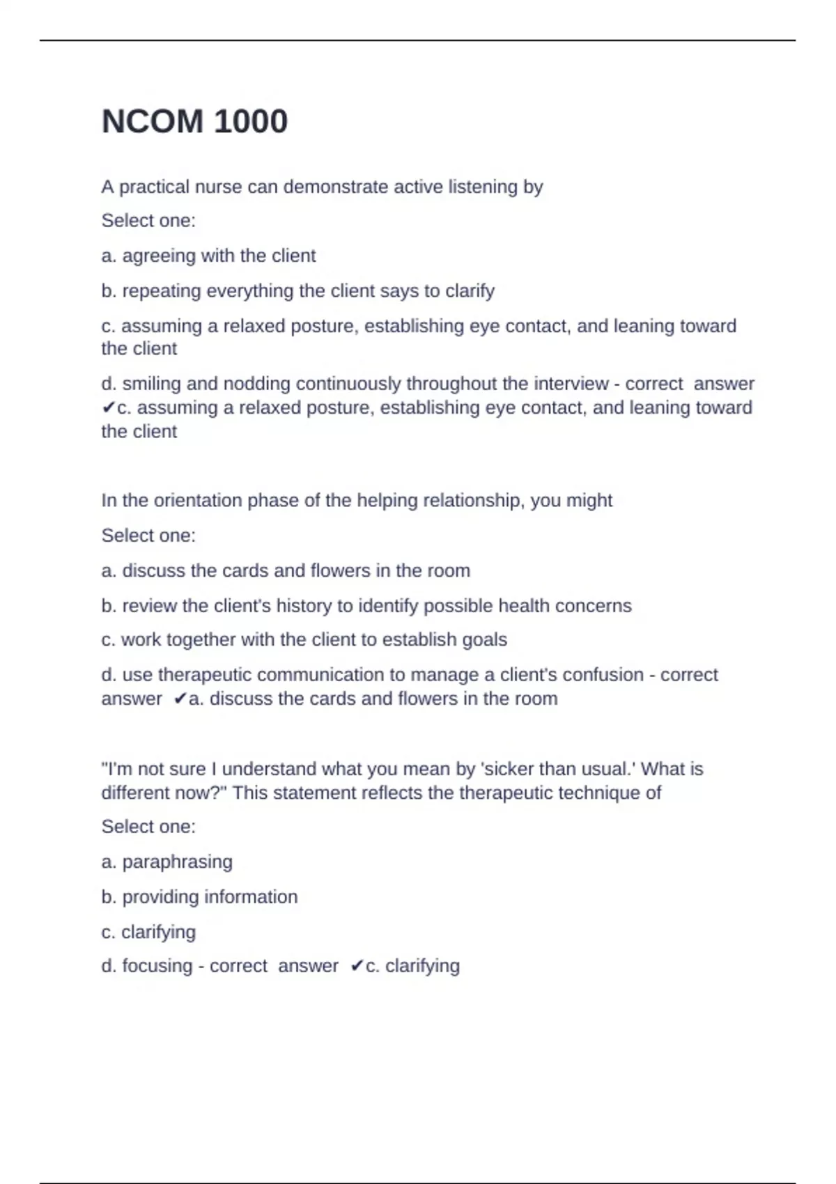✔c. assuming a relaxed posture, establishing eye contact, and leaning toward