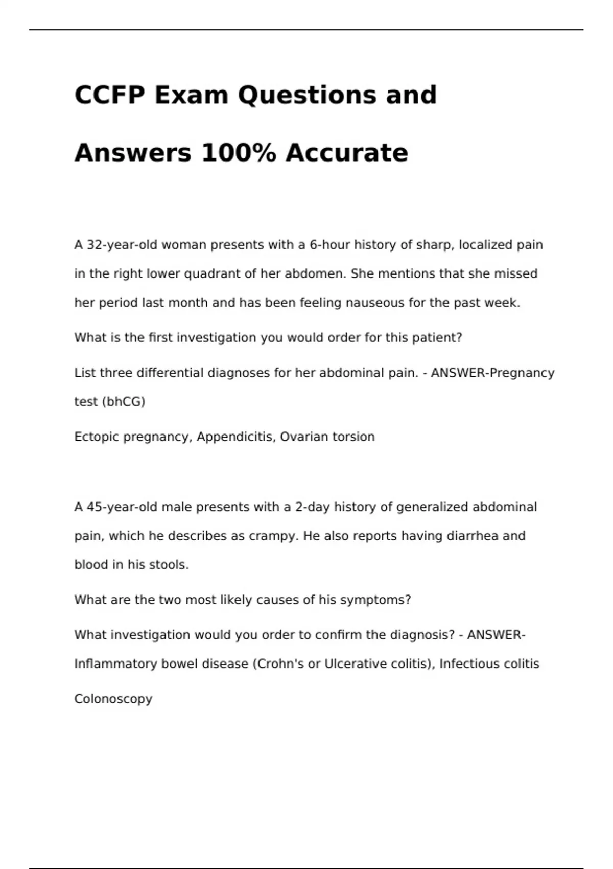 List three differential diagnoses for her abdominal pain. - ANSWER-Pregnancy