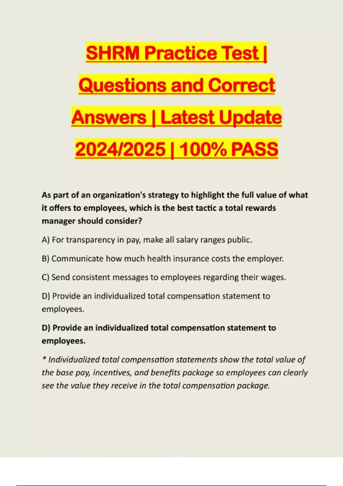 SHRM Practice Test | Questions and Correct Answers | Latest Update 2024/2025 | 100% PASS As part of an organization's strategy to highlight the full value of what it offers to employees, which is the best tactic a total rewards manager should consider? A) For transparency in pay, make all salary ranges public. B) Communicate how much health insurance costs the employer. C) Send consistent messages to employees regarding their wages. D) Provide an individualized total compensation statement to employees. D) Provide an individualized total compensation statement to employees. * Individualized total compensation statements show the total value of the base pay, incentives, and benefits package so employees can clearly see the value they receive in the total compensation package.What action should HR take to validate that recruiting goals support the overall strategy? A) Create a value driver tree to determine if there is a sight line to the strategy. B) Set recruiting goals to target candidates that fit the culture of the company. C) Measure results of recruiting objectives to make certain all are being met. D) Review recruiting metrics with hiring managers to establish goals. A) Create a value driver tree to determine if there is a sight line to the strategy. * A value driver tree is a tool that may be used to map enterprise-level goals to the functional level. Completing an assessment using a value tree would validate whether or not there is
