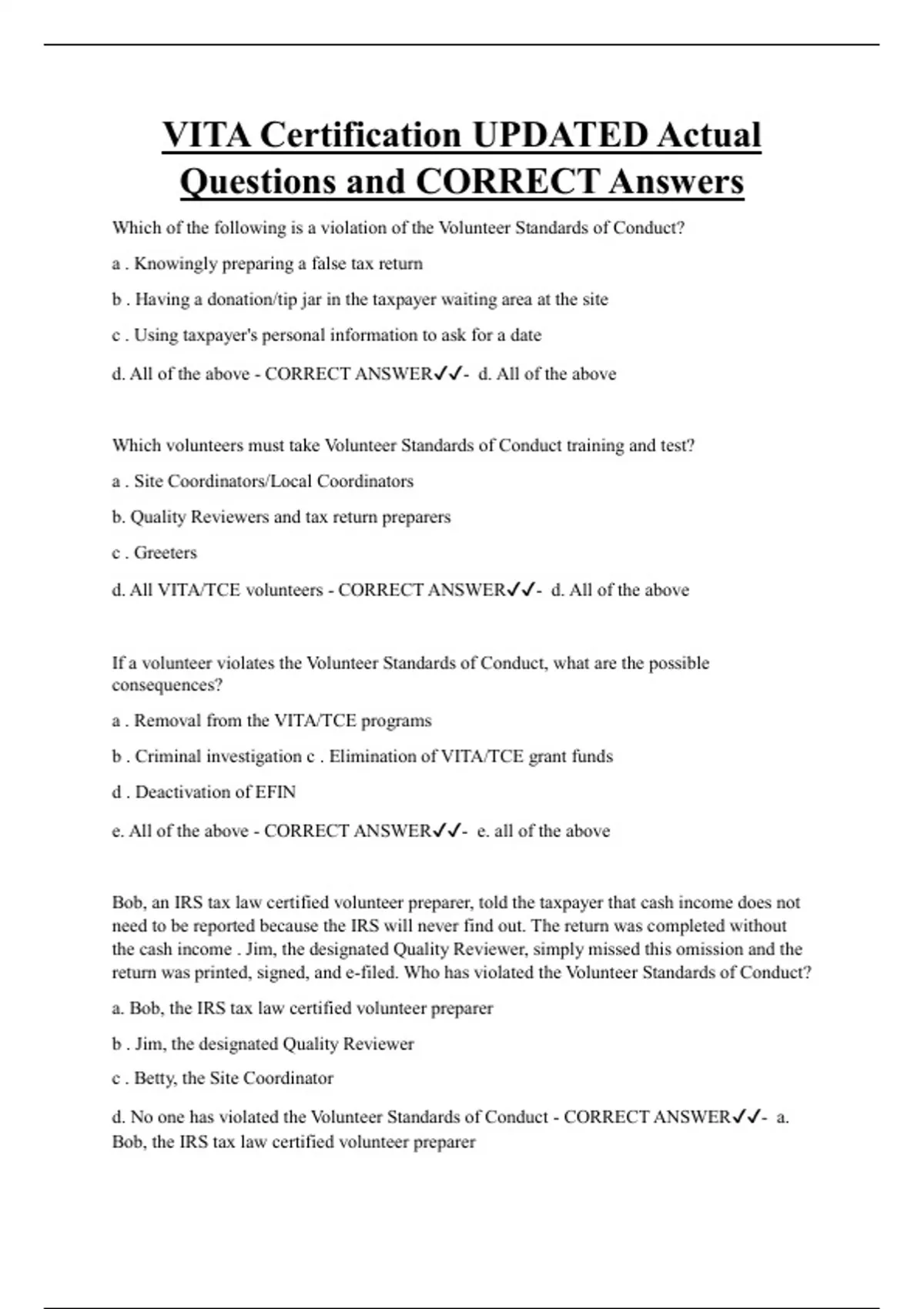 VITA Certification UPDATED Actual Questions and CORRECT Answers Which of the following is a violation of the Volunteer Standards of Conduct? a . Knowingly preparing a false tax return b . Having a donation/tip jar in the taxpayer waiting area at the site c . Using taxpayer's personal information to ask for a date d. All of the above - CORRECT ANSWER- d. All of the abov