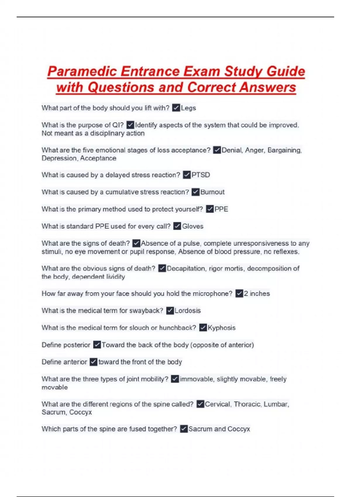 Paramedic Entrance Exam Study Guide with Questions and Correct Answers
