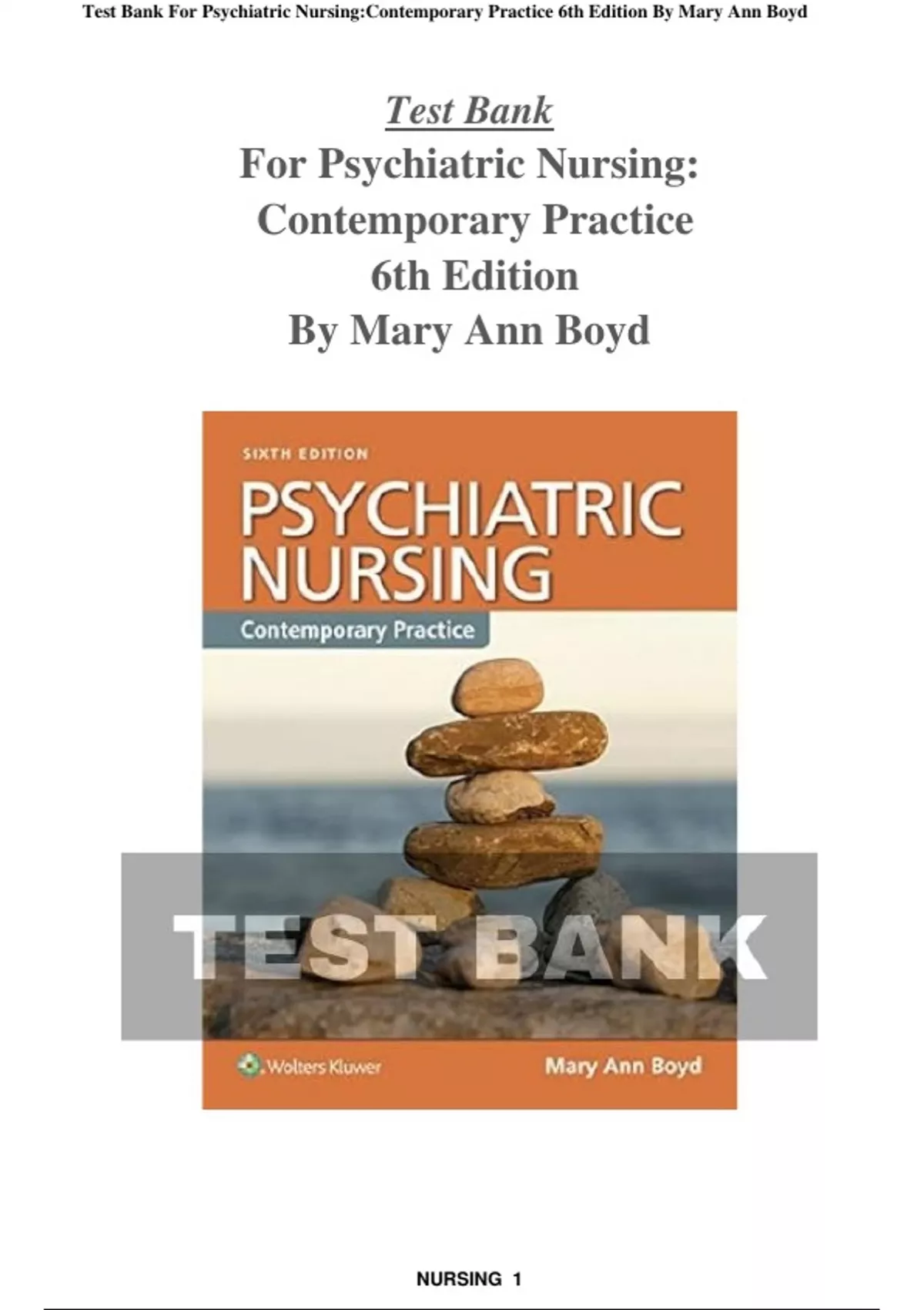 Test Bank For Psychiatric Nursing:Contemporary Practice 6th Edition By Mary Ann Boyd This isn't a book,a test bank is a collection of pre-written exam questions and answers designed to help educators assess and evaluate students' knowledge and understanding of course material. It serves as a valuable resource for creating quizzes and exams, saving instructors time and ensuring a fair and comprehensive assessment of students' learning.