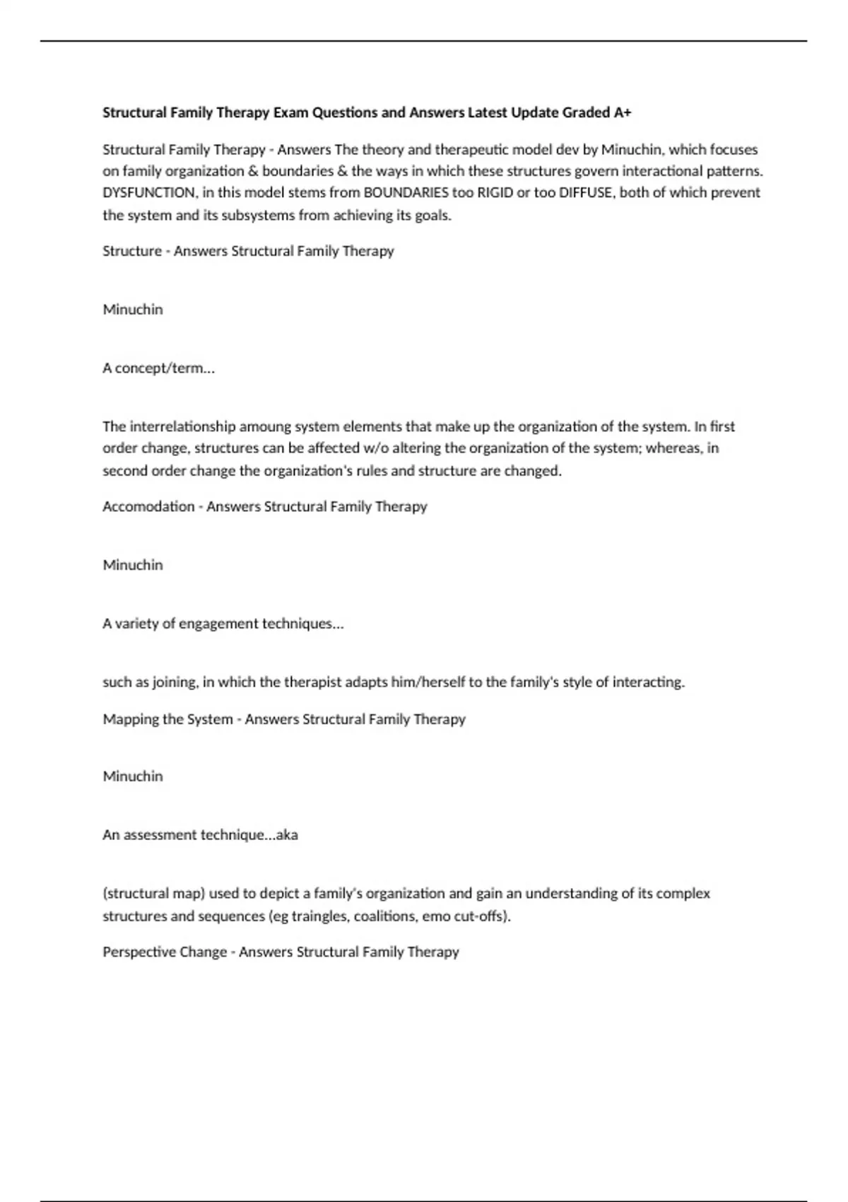 Structural Family Therapy - Answers The theory and therapeutic model dev by Minuchin, which focuses