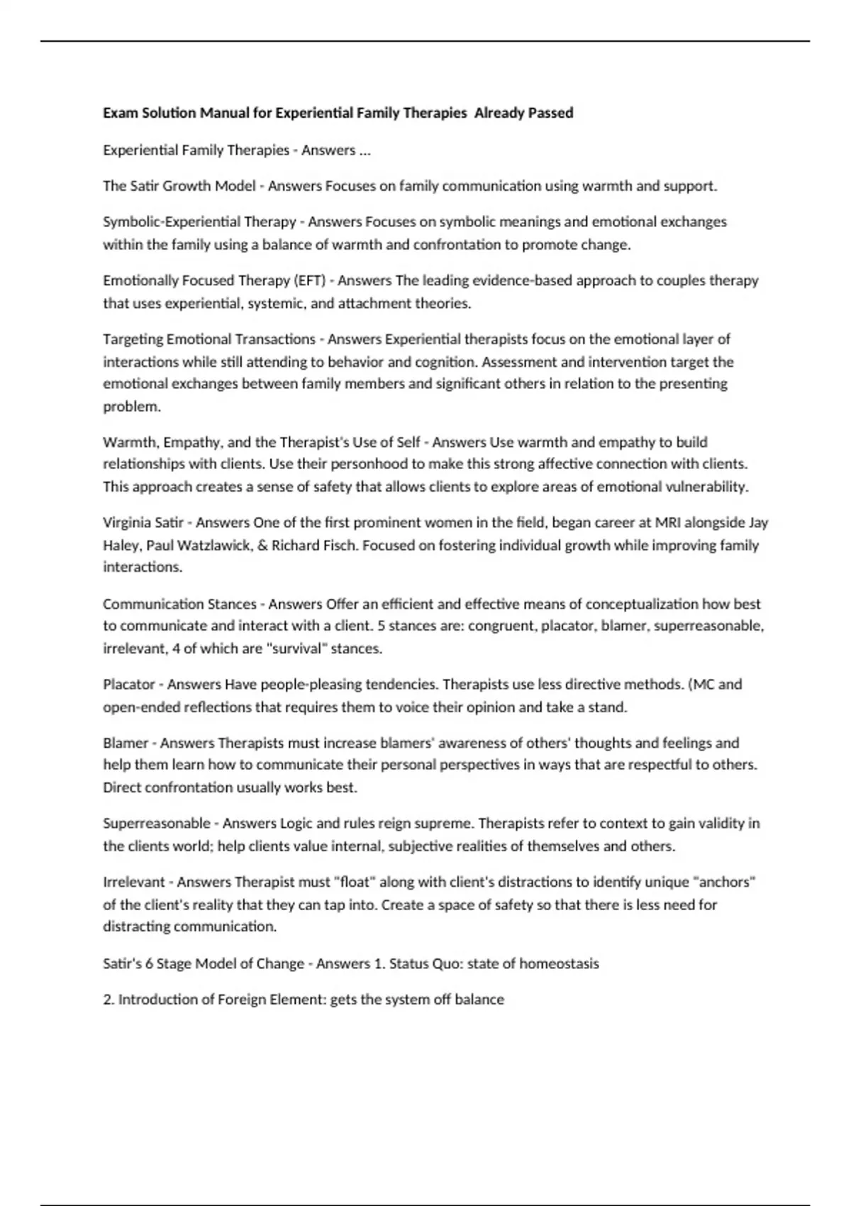 Exam Solution Manual for Experiential Family Therapies Already Passed