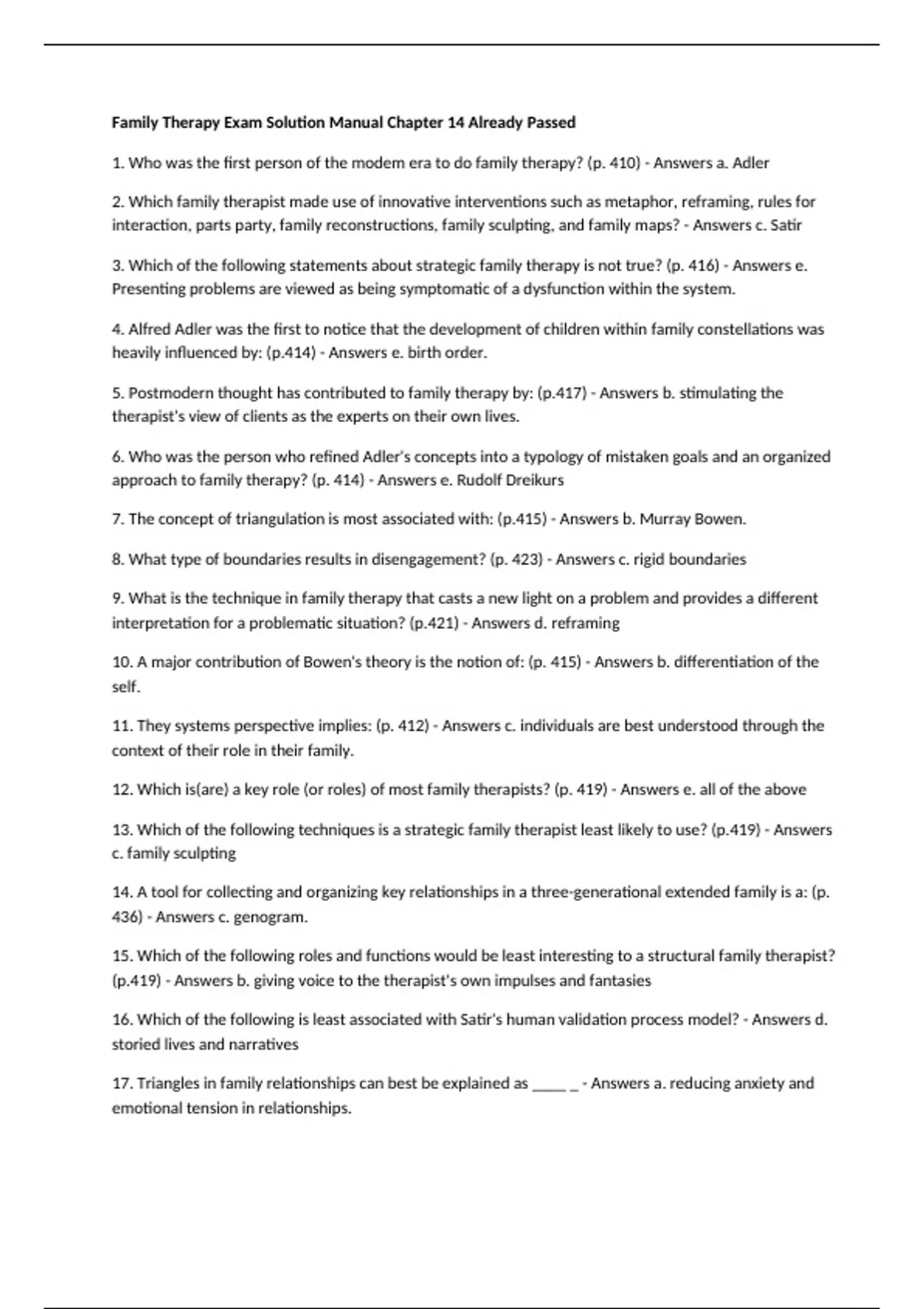 1. Who was the first person of the modem era to do family therapy? (p. 410) - Answers a. Adler