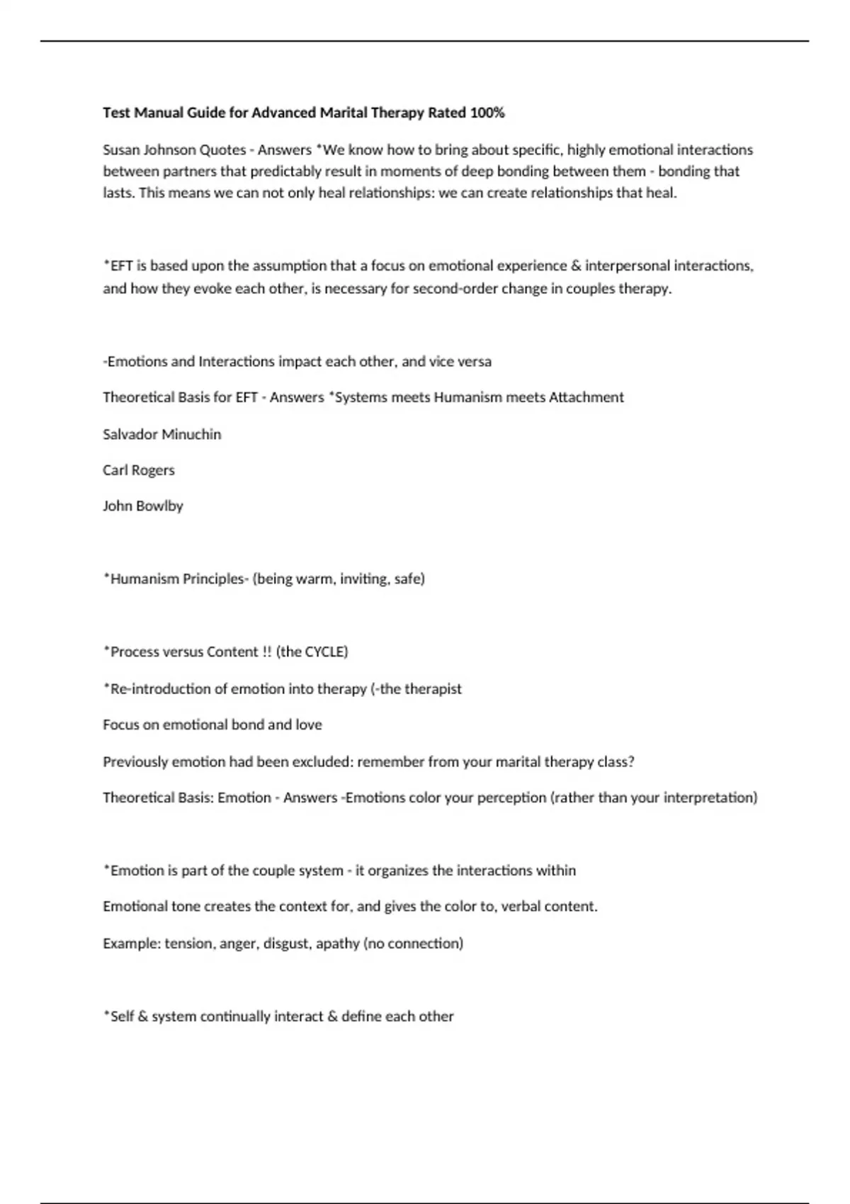 Test Manual Guide for Advanced Marital Therapy Rated 100% Susan Johnson Quotes - Answers *We know how to bring about specific, highly emotional interactions between partners that predictably result in moments of deep bonding between them - bonding that lasts. This means we can not only heal relationships: we can create relationships that heal. *EFT is based upon the assumption that a focus on emotional experience & interpersonal interactions, and how they evoke each other, is necessary for second-order change in couples therapy. -Emotions and Interactions impact each other, and vice versa Theoretical Basis for EFT - Answers *Systems meets Humanism meets Attachment Salvador Minuchin Carl Rogers John Bowlby *Humanism Principles- (being warm, inviting, safe) *Process versus Content !! (the CYCLE) *Re-introduction of emotion into therapy (-the therapist Focus on emotional bond and love Previously emotion had been excluded: remember from your marital therapy class? Theoretical Basis: Emotion - Answers -Emotions color your perception (rather than your interpretation) *Emotion is part of the couple system - it organizes the interactions within Emotional tone creates the context for, and gives the color to, verbal content. Example: tension, anger, disgust, apathy (no connection) *Self & system continually interact & define each other Intra-psychic (heart) and inter-personal (heart that must interact with reality) processes If emotions are intense, they override other cues Theoretical Basis: Systems - Answers *Rigid interaction cycles are formed *Emotional responses create & reflect interaction patterns, and interaction patterns create & reflect emotional responses. *Emotions are the context for - and give meaning to - interactions, and interactions are context for emotional responses. *The reprocessing, regulation, or modification of affect may then be the most powerful & efficient way to change the organization of a system. As to change a dance by changing music (important)-->New emotions & responses create a new systemic interaction, or pattern How is EFT different? - Answers note: We're not teaching people how to communicate, we're teaching people how to feel safe. Then going from there. *Focus on intra-psychic and interpersonal processes *Not communication based *Systems & emotions - creating new experiences *Journey from isolation to connectedness *When EFT is successfully implemented, each partner becomes a source of security, protection, and contact comfort for the other. Each partner can then assist the other in regulating negative affect & constructing a positive & potent sense of self. How is EFT different (2)? - Answers *Therapist is process consultant & choreographer *Here & now focus (not as much FOO/Bowen) *Focus on attachment and emotional bond *Emotional focus *Acceptance of people for who they are, right now (any behavior is a sign of distress!!!!) View of behaviors as cues of distress Overview of Therapy - Answers Stage 1: Steps 1-4 Stage 2: Steps 5-7 Stage 3: Steps 8-9 Realistically probably 8-12 sessions Stage 1 - Answers *The de-escalation of negative cycles of interaction Step 1: create an alliance, decrease conflict issues in the core attachment struggle (trying to figure out what the issue is) Step 2: identify negative interaction cycle where attachment issues are expressed ( Step 3: access/identify unacknowledged emotions underlying interactions Step 4: reframe problem as negative cycle + emotions + attachment needs. Cycle viewed as common enemy (be mad at the cycle, not the spouse that acts like &$*$) Stage 2 - Answers *Changing interactional positions Step 5: promote identification with disowned attachment emotions, needs, & aspects of self ... and integrating into these into relationship interactions. Step 6: promote acceptance of the partner's experience & new interactional responses Step 7: facilitate expression of needs & wants - and creating emotional engagement & bonding events that can redefine attachment Stage 3 - Answers *Consolidation & Integration Step 8: facilitate new solutions to old relationship problems Step 9: consolidate new positions & new cycles of attachment behaviors Process of Change - Answers *Three major shifts: -Negative cycle de-escalation --End of stage 1 --1st order change - yet hope instilled -Withdrawer engagement