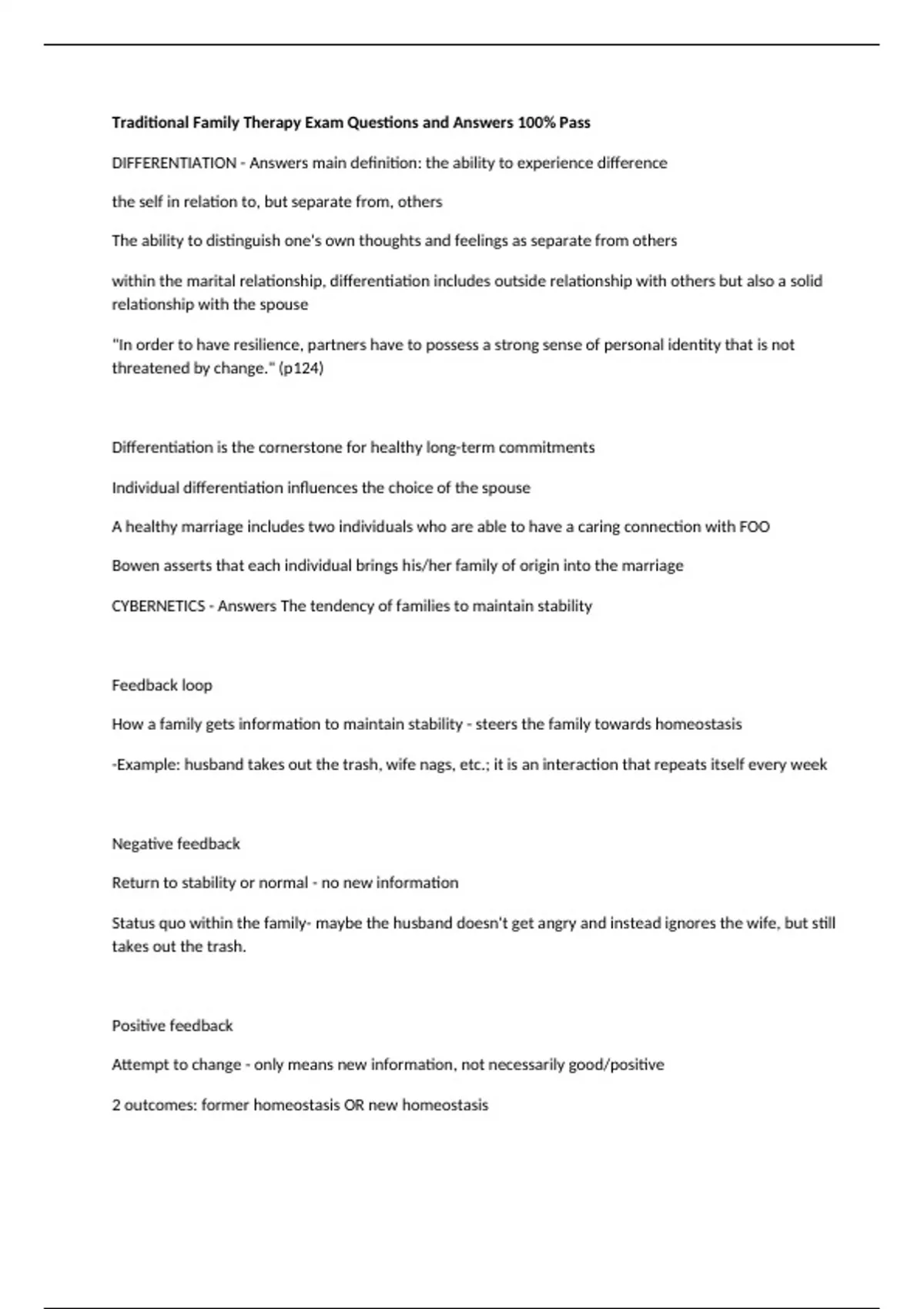 Traditional Family Therapy Exam Questions and Answers 100% Pass