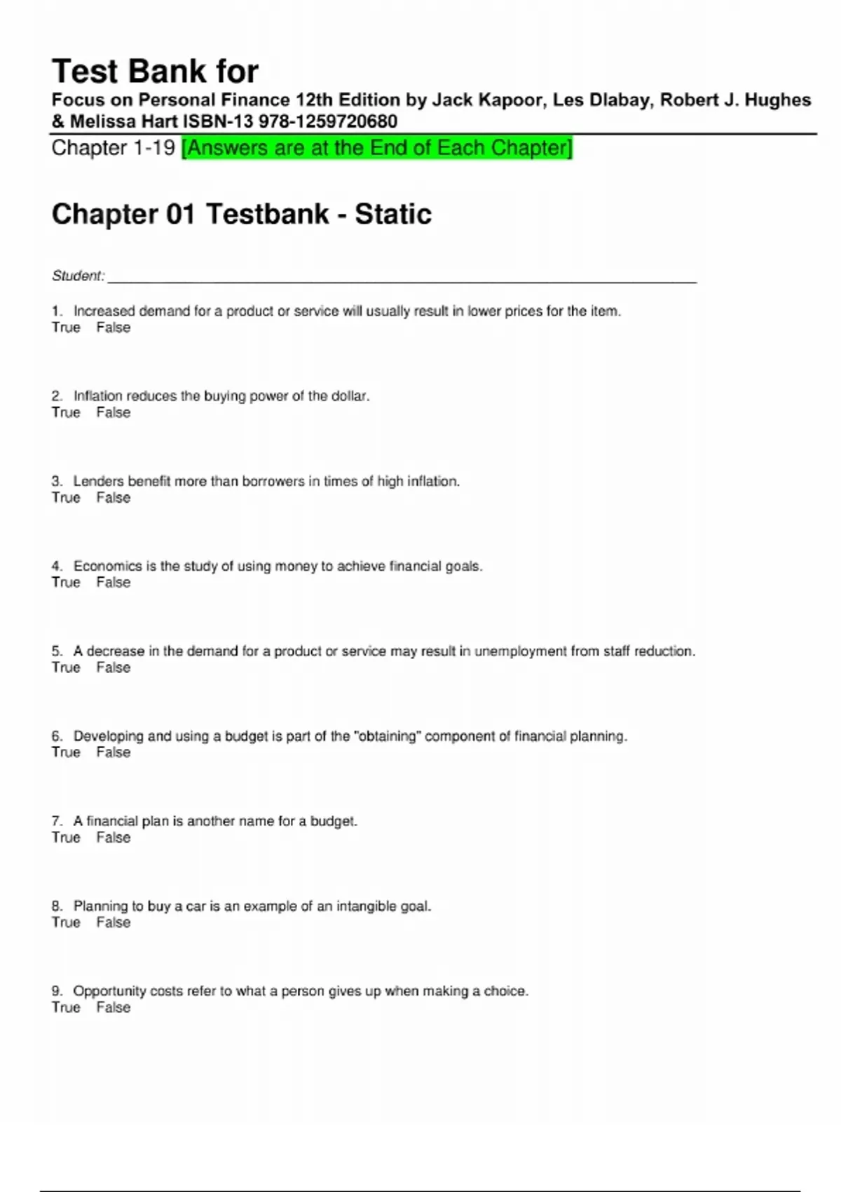 Test Bank for Focus on Personal Finance 12th Edition by Jack Kapoor, Les Dlabay, Robert J. Hughes & Melissa Hart. Part 1: Planning Your Personal Finances Chapter 1: Personal Finance Basics and the Time Value of Money Appendix: The Time Value of Money? Chapter 2: Financial Aspects of Career Planning? Appendix: Résumés, Cover Letters, and Interviews? Chapter 3: Money Management Strategy: Financial Statements and Budgeting? Appendix: Money Management Information Sources and Advisors? Chapter 4: Planning Your Tax Strategy? Part 2: Managing Your Personal Finances Chapter 5: Financial Services: Savings Plans and Payment Methods Chapter 6: Introduction to Consumer Credit Chapter 7: Choosing a Source of Credit: The Costs of Credit Alternatives Part 3: Making Your Purchasing Decisions Chapter 8: Consumer Purchasing Strategies and Legal Protection Appendix: Consumer Protection Agencies and Organizations Chapter 9: The Housing Decision: Factors and Finances Part 4: Insuring Your Resources Chapter 10: Property and Motor Vehicle Insurance? Chapter 11: Health, Disability, and Long-Term Care Insurance? Chapter 12: Life Insurance? Part 5: Investing Your Financial Resources Chapter 13: Investing Fundamentals? Chapter 14: Investing in Stocks? Chapter 15: Investing in Bonds? Chapter 16: Investing in Mutual Funds? Chapter 17: Investing in Real Estate and Other Investment Alternatives Part 6: Controlling Your Financial Future Chapter 18: Starting Early: Retirement Planning? Chapter19: Estate Planning