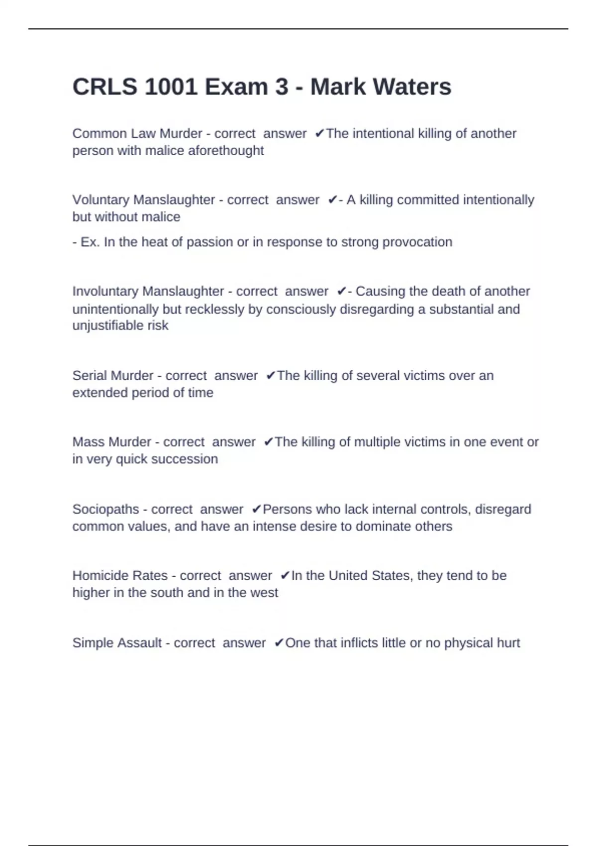CRLS 1001 Exam 3 Questions with complete solution 2024/2025 CRLS 1001 Exam 3 - Mark Waters Common Law Murder - correct answer The intentional killing of another person with malice aforethought Voluntary Manslaughter - correct answer - A killing committed intentionally but without malice - Ex. In the heat of passion or in response to strong provocation Involuntary Manslaughter - correct answer - Causing the death of another unintentionally but recklessly by consciously disregarding a substantial and unjustifiable risk Serial Murder - correct answer The killing of several victims over an extended period of time Mass Murder - correct answer The killing of multiple victims in one event or in very quick succession Sociopaths - correct answer Persons who lack internal controls, disregard common values, and have an intense desire to dominate others Homicide Rates - correc