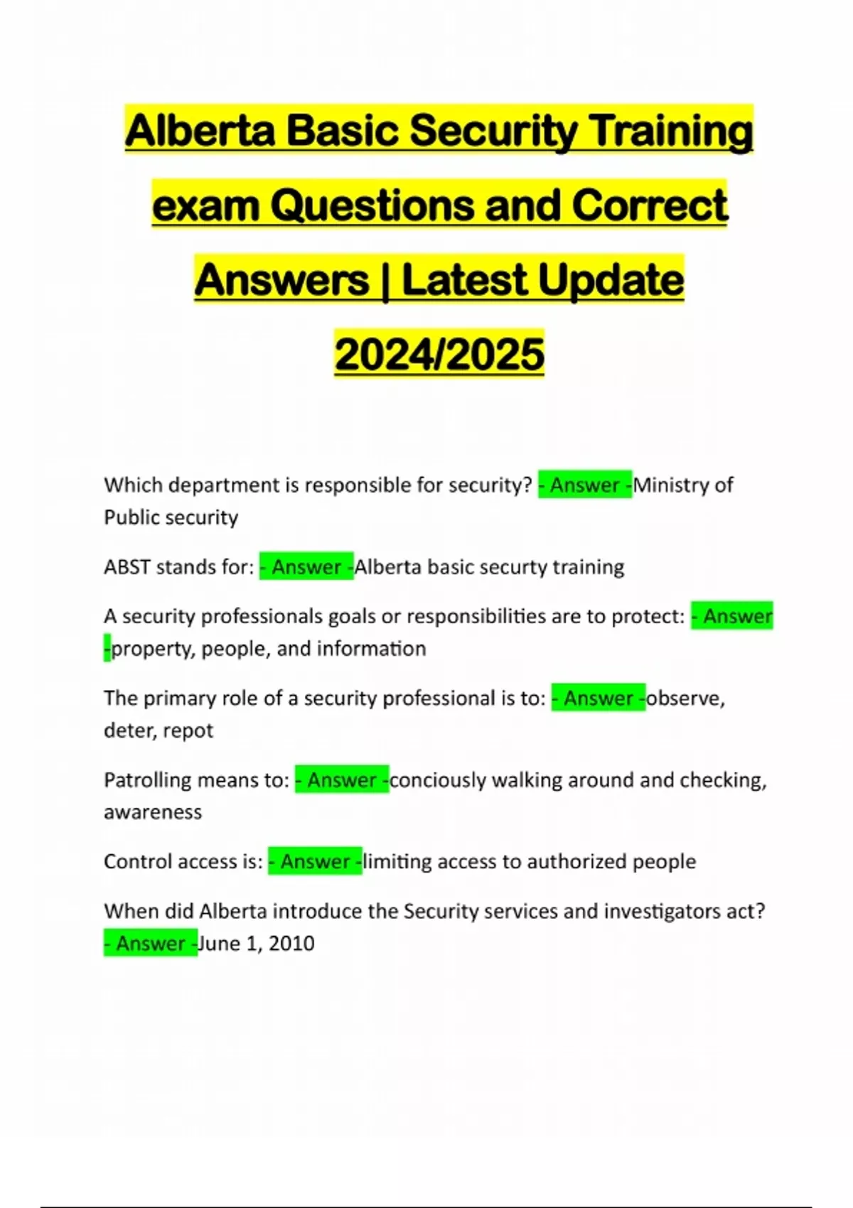 Alberta Basic Security Training exam Questions and Correct Answers | Latest Update 2024/2025