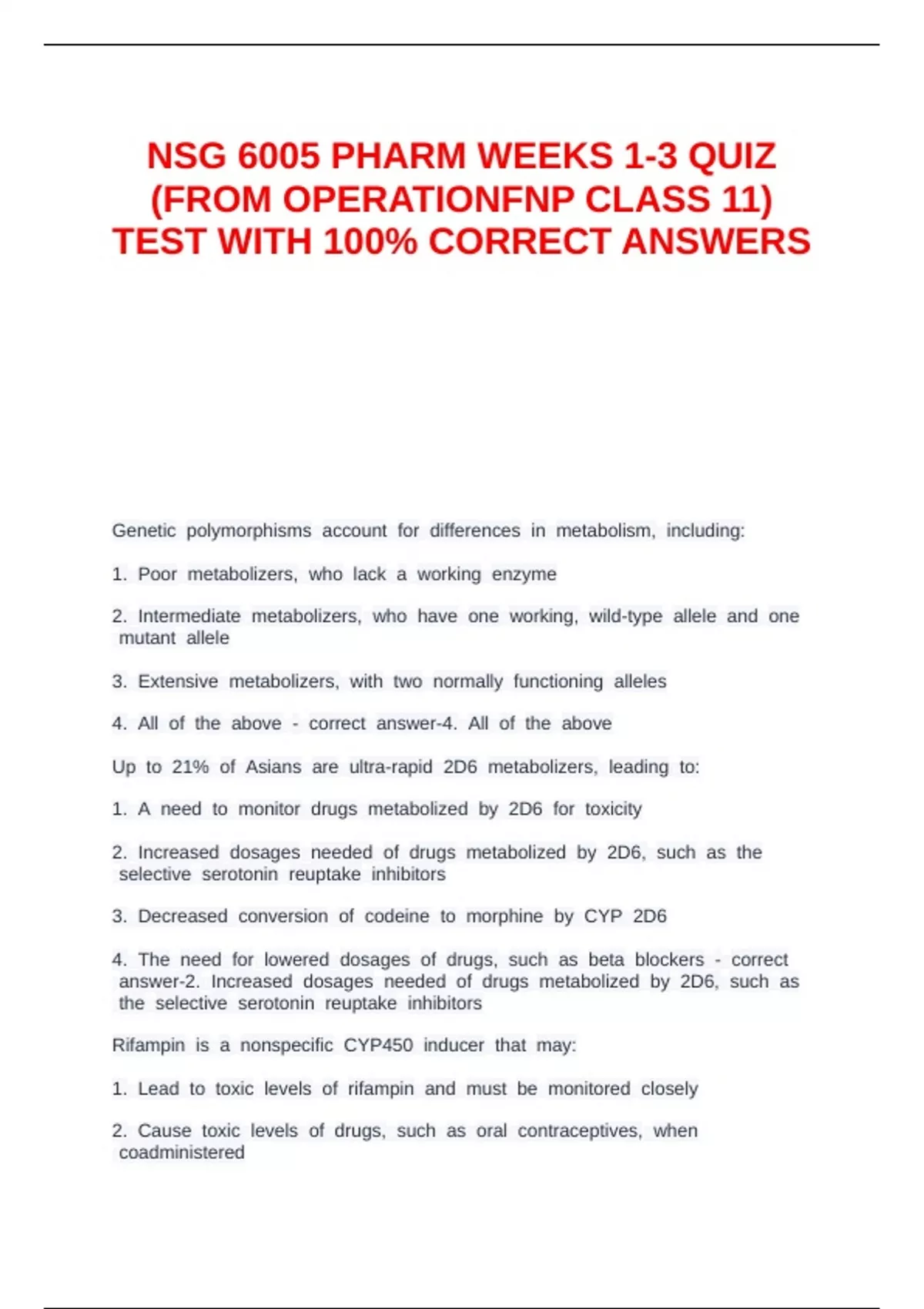 NSG 6005 PHARM WEEKS 1-3 QUIZ (FROM OPERATIONFNP CLASS 11) TEST