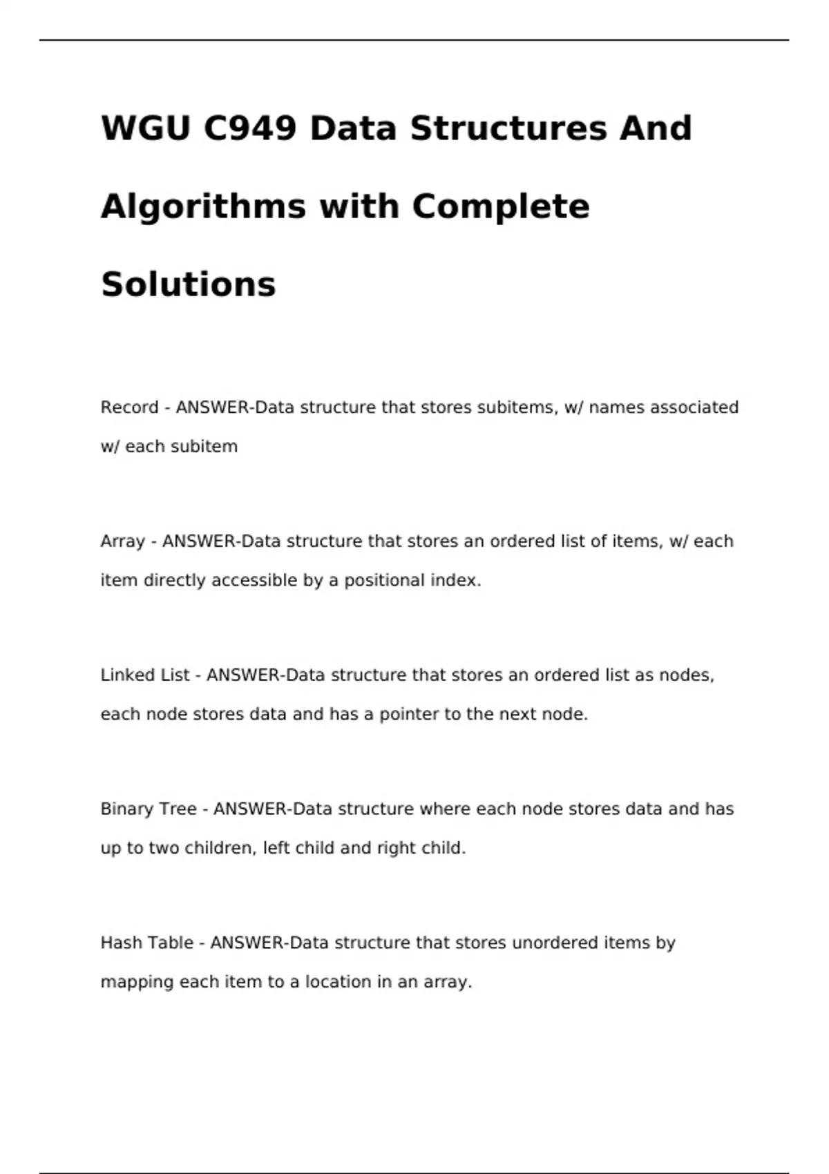 WGU C949 Data Structures And Algorithms with Complete SolutionsWGU C949 Data Structures And Algorithms with Complete SolutionsWGU C949 Data Structures And Algorithms with Complete SolutionsWGU C949 Data Structures And Algorithms with Complete Solutions Record - ANSWER-Data structure that stores subitems, w/ names associated w/ each subitem Array - ANSWER-Data structure that stores an ordered list of items, w/ each item directly accessible by a positional index. Linked List - ANSWER-Data structure that stores an ordered list as nodes, each node stores data and has a pointer to the next node.