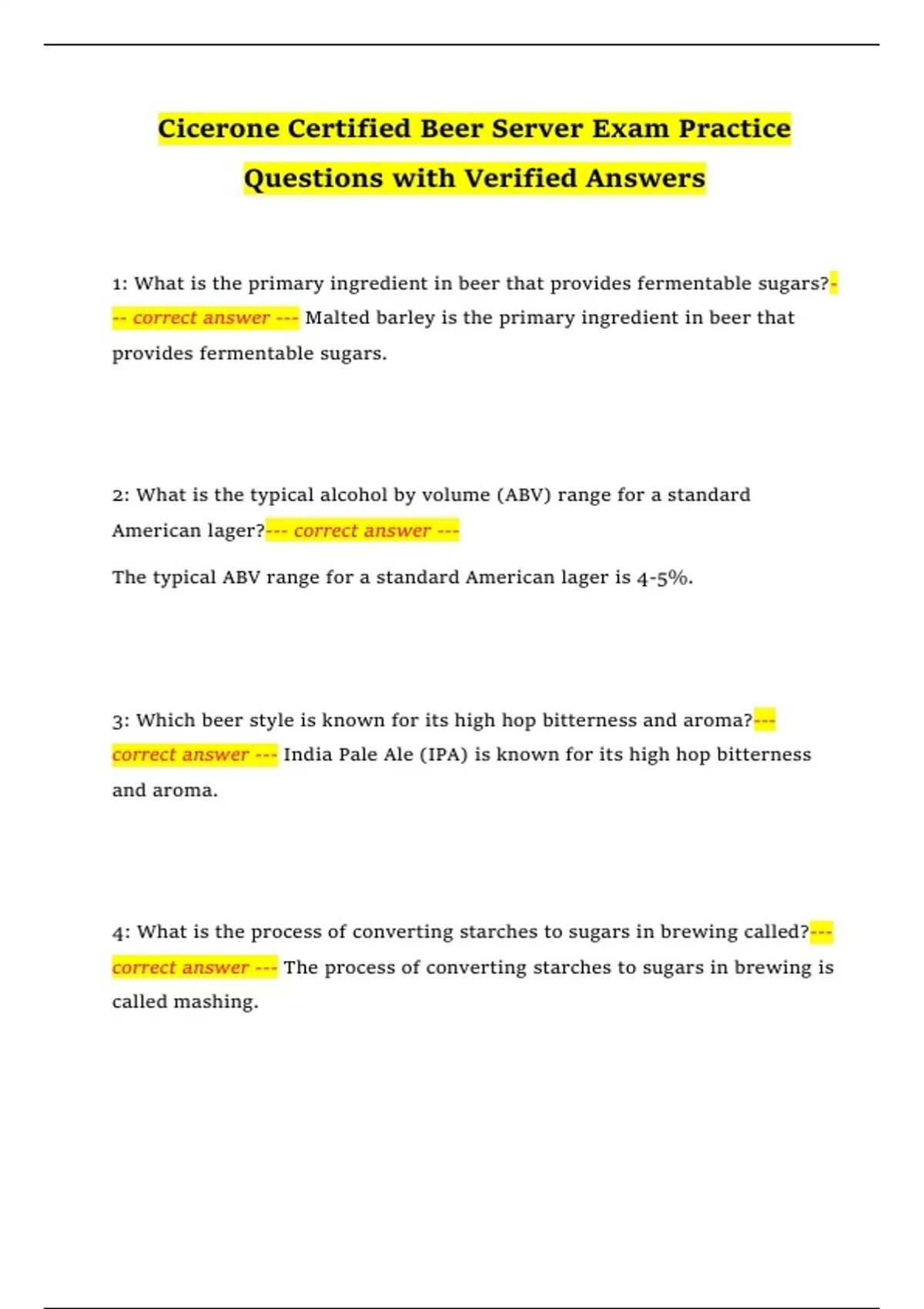 Cicerone Certified Beer Server Exam Practice Questions with Verified Answers 1: What is the primary ingredient in beer that provides fermentable sugars?--- correct answer --- Malted barley is the primary ingredient in beer that provides fermentable sugars. 2: What is the typical alcohol by volume (ABV) range for a standard American lager?--- correct answer --- The typical ABV range for a standard American lager is 4-5%. 3: Which beer style is known for its high hop bitterness and aroma?--- correct answer --- India Pale Ale (IPA) is known for its high hop bitterness and aroma.