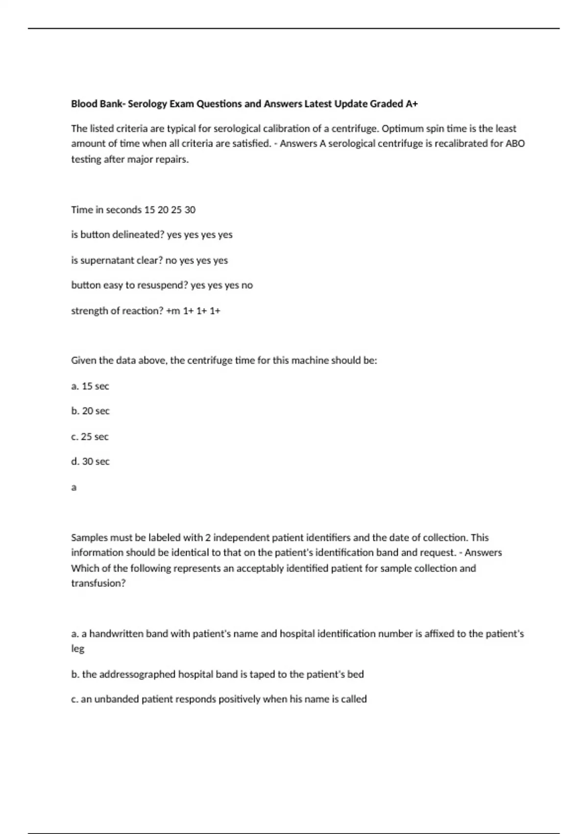 Blood Bank- Serology Exam Questions and Answers Latest Update Graded A+ The listed criteria are typical for serological calibration of a centrifuge. Optimum spin time is the least amount of time when all criteria are satisfied. - Answers A serological centrifuge is recalibrated for ABO testing after major repairs. Time in seconds is button delineated? yes yes yes yes is supernatant clear? no yes yes yes button easy to resuspend? yes yes yes no strength of reaction? +m 1+ 1+ 1+ Given the data above, the centrifuge time for this machine should be: a. 15 sec b. 20 sec c. 25 sec d. 30 sec a Samples must be labeled with 2 independent patient identifiers and the date of collection. This information should be identical to that on the patient's identification band and request. - Answers Which of the following represents an acceptably identified patient for sample collection and transfusion? a. a handwritten band with patient's name and hospital identification number is affixed to the patient's leg b. the addressographed hospital band is taped to the patient's bed c. an unbanded patient responds positively when his name is called d. the chart transported with the patient contains his armband not yet attached d Results of ABO and Rh testing on a current specimen must always be compared to that of a previous transfusion period. Errors in typing or patient identification may be detected when discrepancies are found. Collection of a new sample allows determination of which sample was incorrectly collected. - Answers Samples from the same patient were received on 2 consecutive days. Test results are summarized below: Day #1 Day #2 anti-A 4+ 0 anti-B 0 4+ anti-D 3+ 3+ A1 cells 0 4+ B cells 4+ 0 Ab screen 0 0 How should the request for crossmatch be handled? a. crossmatch A, Rh-positive units with sample from day 1 b. crossmatch B, Rh-positive units with sample from day 2 c. crossmatch AB, Rh-positive units with both samples d. collect a new sample and repeat the tests c A serological test to confirm the ABO on all RBC units and Rh on units labeled as Rh-negative must be performed prior to transfusion. Any errors in labeling must be reported to the collection facility - Answers The following test results are noted for a unit of blood labeled group A, Rh-negative: Cells tested with: anti-A anti-B anti-D 4+ 0 3+ What should be done next? a. transfuse as a group A, Rh-negative b. transfuse as a group A, Rh-positive c. notify the collecting facility d. discard the unit c Samples must be labeled with 2 independent patient identifiers and the date of collection. This information should be identical to that on the patients identification band and request. There must be a mechanism to identify the phlebotomist, but initialing the sample tubes is not required. - Answers What information is essential on patient blood sample labels drawn for compatibility testing? a. biohazard sticker for AIDS patient b. patient's room number c. unique patient medical number d. phlebotomist initials b Granulocytes must be compatible with the recipient's serum. Granulocyte products have an expiration of 24 hours. - Answers Granulocytes for transfusion should: