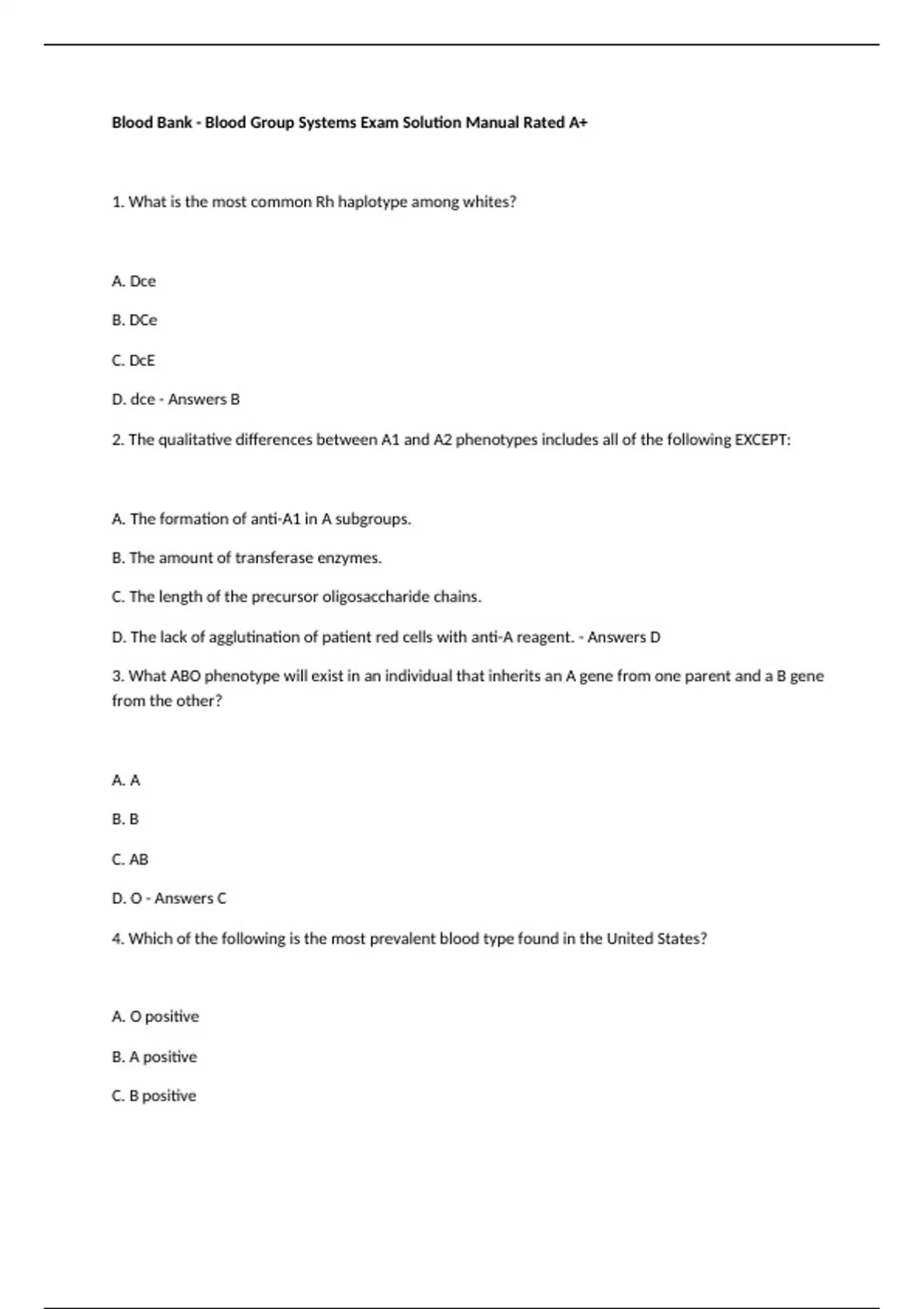 Blood Bank - Blood Group Systems Exam Solution Manual Rated A+ 1. What is the most common Rh haplotype among whites? A. Dce B. DCe C. DcE D. dce - Answers B 2. The qualitative differences between A1 and A2 phenotypes includes all of the following EXCEPT: A. The formation of anti-A1 in A subgroups. B. The amount of transferase enzymes. C. The length of the precursor oligosaccharide chains. D. The lack of agglutination of patient red cells with anti-A reagent. - Answers D 3. What ABO phenotype will exist in an individual that inherits an A gene from one parent and a B gene from the other? A. A B. B C. AB D. O - Answers C 4. Which of the following is the most prevalent blood type found in the United States? A. O positive B. A positive C. B positive D. O negative - Answers A 5. What is his MOST likely genotype for a white male who has the following Rh antigens C,c,D,E,e? A. R1r B. R1R2 C. Ror D. r'r" - Answers B 6. The serum from a patient of African-American descent is reactive with all screening and panel cells. Which antibody directed to a high incidence antigen is most likely to be present? A. Anti-Lub B. Anti-Jk3 C. Anti-U D. Anti-Ku - Answers C 7. If the parents are group A and B respectively, what are the possible blood groups of their children? A. A and B only B. A and B and AB only C. A and B and O only D. A and B and AB and O - Answers D 8. What is the most common (highest probability percentage) possible phenotype of the mating between a mother who has an AB genotype and a father who has an AO genotype? A. AB B. B C. A D. O - Answers C 9. Phenotype refers to: A. The genes inherited from each parent B. Opposing antigens produced by genes C. The presence of two or more alleles at a locus D. The expression of traits - Answers D 10. The McLeod phenotype is associated with which of the following antigen systems? A. Rh B. P C. Kell D. MNSs - Answers C 11. In immunohematology, an antithetical relationship exists between M antigen and which of these antigens? A. K antigen B. S antigen C. Lu6 antigen D. N antigen - Answers D 12. Which specific immunodominant sugar is responsible for A (blood group A) antigenic specificity? A. L-fucose B. D-galactose C. N-acetyl-D-galactosamine D. Glucose - Answers C 13. In which group is Type B blood found in higher frequency? A. African Americans B. Caucasians C. Asians D. Hispanics - Answers C 14. Which genotype(s) is/are possible for a mating of an AB mother and an AB father? A. AB only B. AA and BB C. AB, AA, and BB D. All genotypes are possible - Answers C 15. Which one of these Lewis blood group system phenotypes usually produces anti-Lea? A. Le(a+b+) B. Le(a+b-) C. Le(a-b+) D. Le(a-b-) - Answers D 16. Lewis Blood Group System is a human blood group unlike most others. The antigen is produced and secreted by exocrine glands, eventually adsorbing to the surface of red blood cells. Its expression is based on the genetic expression of the Lewis and Secretor genes. Based on the following genotype (Le) (sese), what would you predict the Lewis antigen phenotypic expression to be?