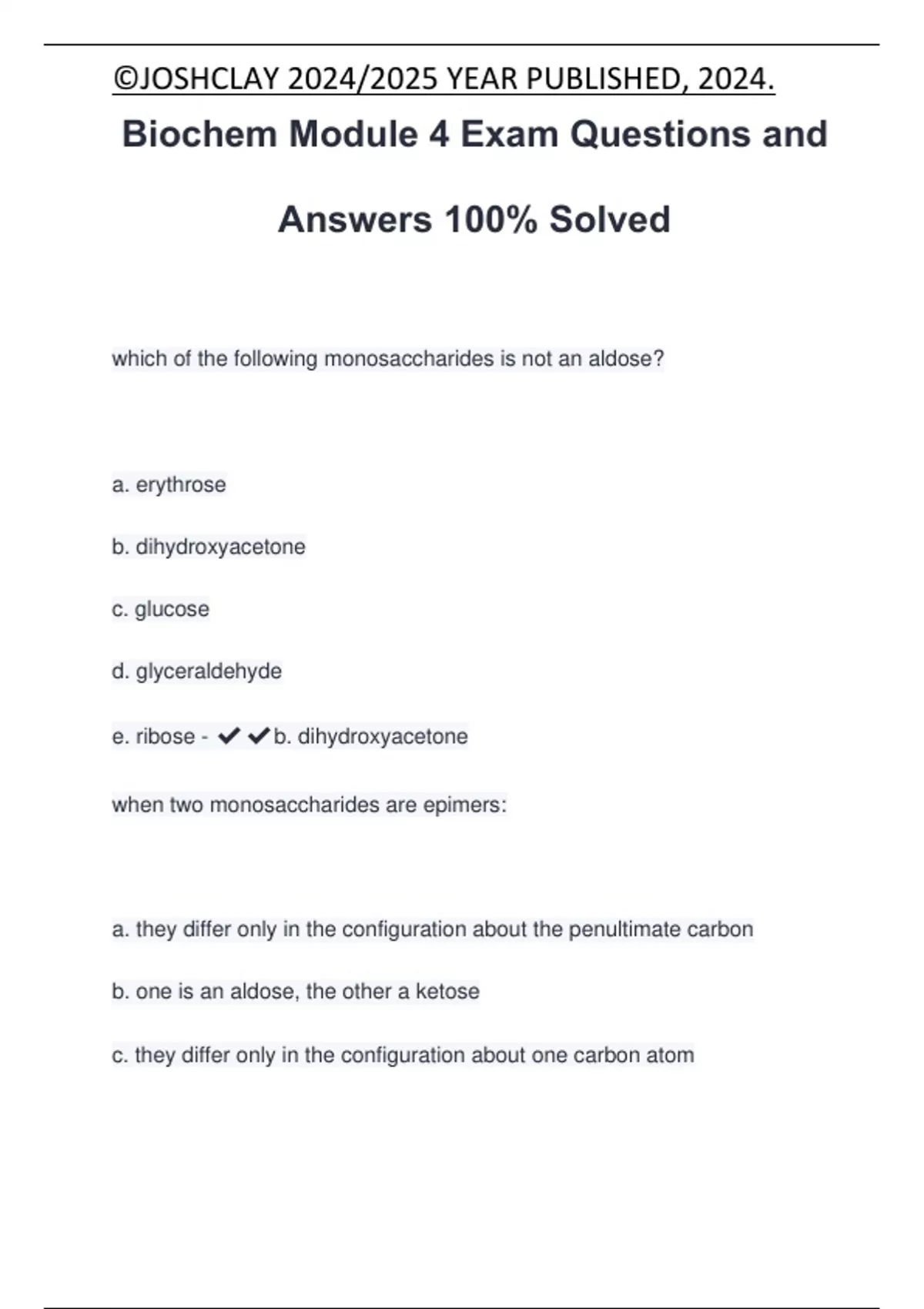 Biochem Module 4 Exam Questions and Answers 100% Solved which of the following monosaccharides is not an aldose? a. erythrose b. dihydroxyacetone c. glucose d. glyceraldehyde e. ribose - b. dihydroxyacetone when two monosaccharides are epimers: a. they differ only in the configuration about the penultimate carbon b. one is an aldose, the other a ketose c. they differ only in the configuration about one carbon atom