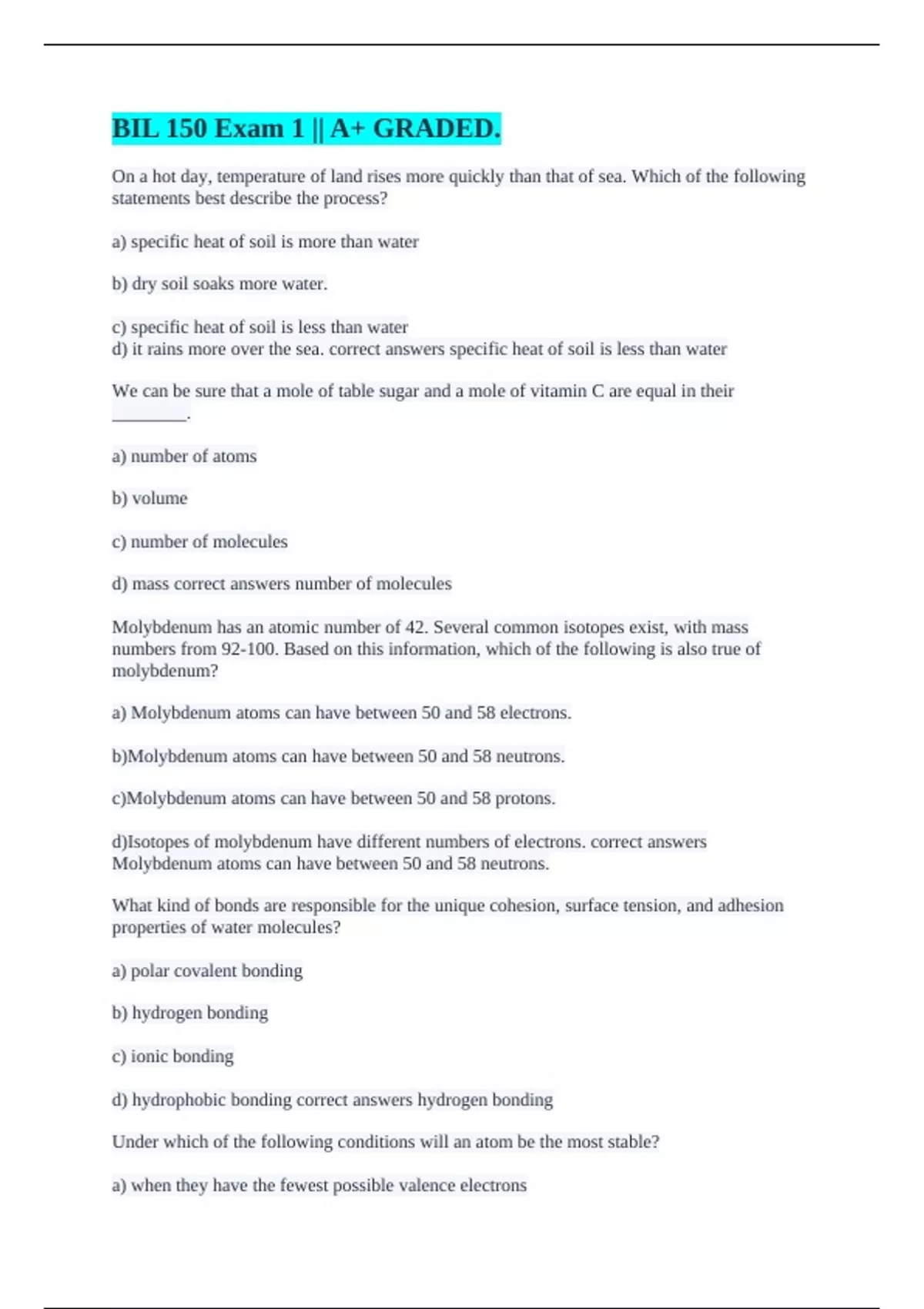 On a hot day, temperature of land rises more quickly than that of sea. Which of the following statements best describe the process? a) specific heat of soil is more than water b) dry soil soaks more water. c) specific heat of soil is less than water d) it rains more over the sea. correct answers specific heat of soil is less than water We can be sure that a mole of table sugar and a mole of vitamin C are equal in their ________. a) number of atoms b) volume c) number of molecules d) mass correct answers number of molecules Molybdenum has an atomic number of 42. Several common isotopes exist, with mass numbers from 92-100. Based on this information, which of the following is also true of molybdenum? a) Molybdenum atoms can have between 50 and 58 electrons. b)Molybdenum atoms can have between 50 and 58 neutrons. c)Molybdenum atoms can have between 50 and 58 protons. d)Isotopes of molybdenum have different numbers of electrons. correct answers Molybdenum atoms can have between 50 and 58 neutrons. What kind of bonds are responsible for the unique cohesion, surface tension, and adhesion properties of water molecules? a) polar covalent bonding b) hydrogen bonding c) ionic bonding d) hydrophobic bonding correct answers hydrogen bonding Under which of the following conditions will an atom be the most stable? a) when they have the fewest possible valence electrons