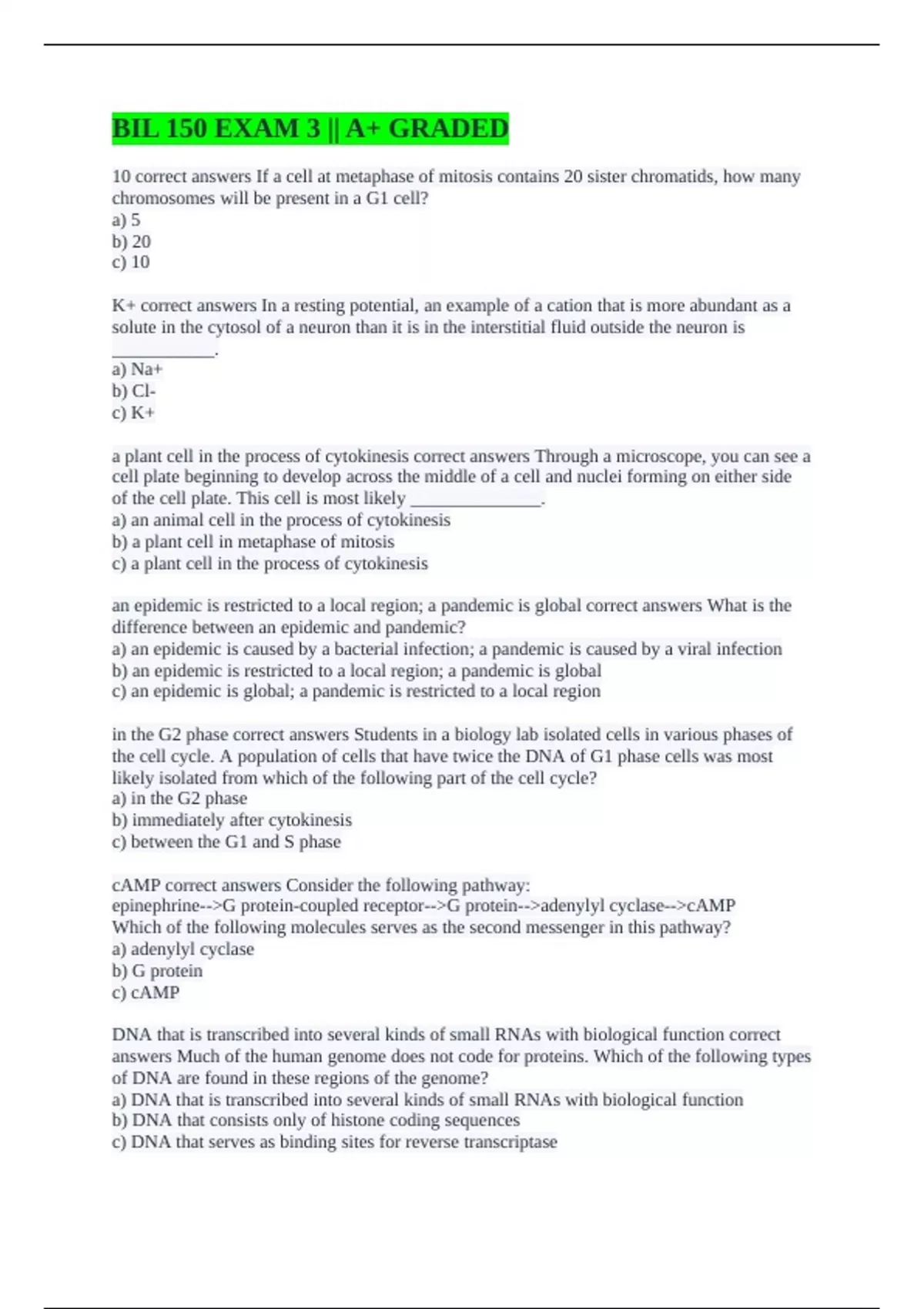 10 correct answers If a cell at metaphase of mitosis contains 20 sister chromatids, how many chromosomes will be present in a G1 cell? a) 5 b) 20 c) 10 K+ correct answers In a resting potential, an example of a cation that is more abundant as a solute in the cytosol of a neuron than it is in the interstitial fluid outside the neuron is ___________. a) Na+ b) Cl- c) K+ a plant cell in the process of cytokinesis correct answers Through a microscope, you can see a cell plate beginning to develop across the middle of a cell and nuclei forming on either side of the cell plate. This cell is most likely ______________. a) an animal cell in the process of cytokinesis b) a plant cell in metaphase of mitosis c) a plant cell in the process of cytokinesis an epidemic is restricted to a local region; a pandemic is global correct answers What is the difference between an epidemic and pandemic? a) an epidemic is caused by a bacterial infection; a pandemic is caused by a viral infection b) an epidemic is restricted to a local region; a pandemic is global c) an epidemic is global; a pandemic is restricted to a local region in the G2 phase correct answers Students in a biology lab isolated cells in various phases of the cell cycle. A population of cells that have twice the DNA of G1 phase cells was most likely isolated from which of the following part of the cell cycle? a) in the G2 phase b) immediately after cytokinesis c) between the G1 and S phase cAMP correct answers Consider the following pathway: epinephrine-->G protein-coupled receptor-->G protein-->adenylyl cyclase-->cAMP Which of the following molecules serves as the second messenger in this pathway? a) adenylyl cyclase b) G protein c) cAMP DNA that is transcribed into several kinds of small RNAs with biological function correct answers Much of the human genome does not code for proteins. Which of the following types of DNA are found in these regions of the genome? a) DNA that is transcribed into several kinds of small RNAs with biological function b) DNA that consists only of histone coding sequences c) DNA that serves as binding sites for reverse transcriptase