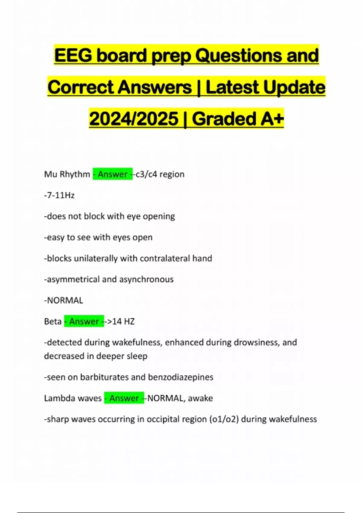 EEG board prep Questions and Correct Answers | Latest Update 2024/2025 | Graded A+ Mu Rhythm - Answer --c3/c4 region -7-11Hz -does not block with eye opening -easy to see with eyes open -blocks unilaterally with contralateral hand -asymmetrical and asynchronous -NORMAL Beta - Answer -->14 HZ -detected during wakefulness, enhanced during drowsiness, and decreased in deeper sleep -seen on barbiturates and benzodiazepines Lambda waves - Answer --NORMAL, awake -sharp waves occurring in occipital region (o1/o2) during wakefulness-visually scanning a picture in a lit room -physiological, eyes OPEN -saccadic eye movement -4-6hz Small sharp spikes / BETS - Answer --occurs in stage 1/stage 2 -peaks at 30-60 years -temporal region -occurs sporadically and short duration -NORMAL benign variant Wicket Spikes - Answer --Single spike or 6-1