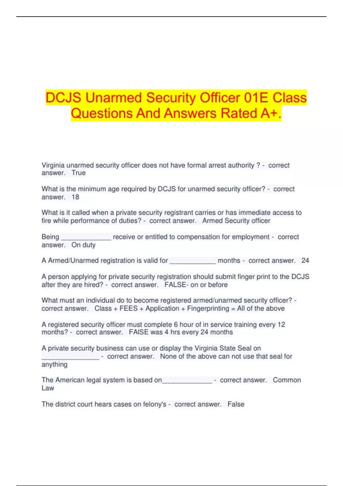 What is the minimum age required by DCJS for unarmed security officer? - correct