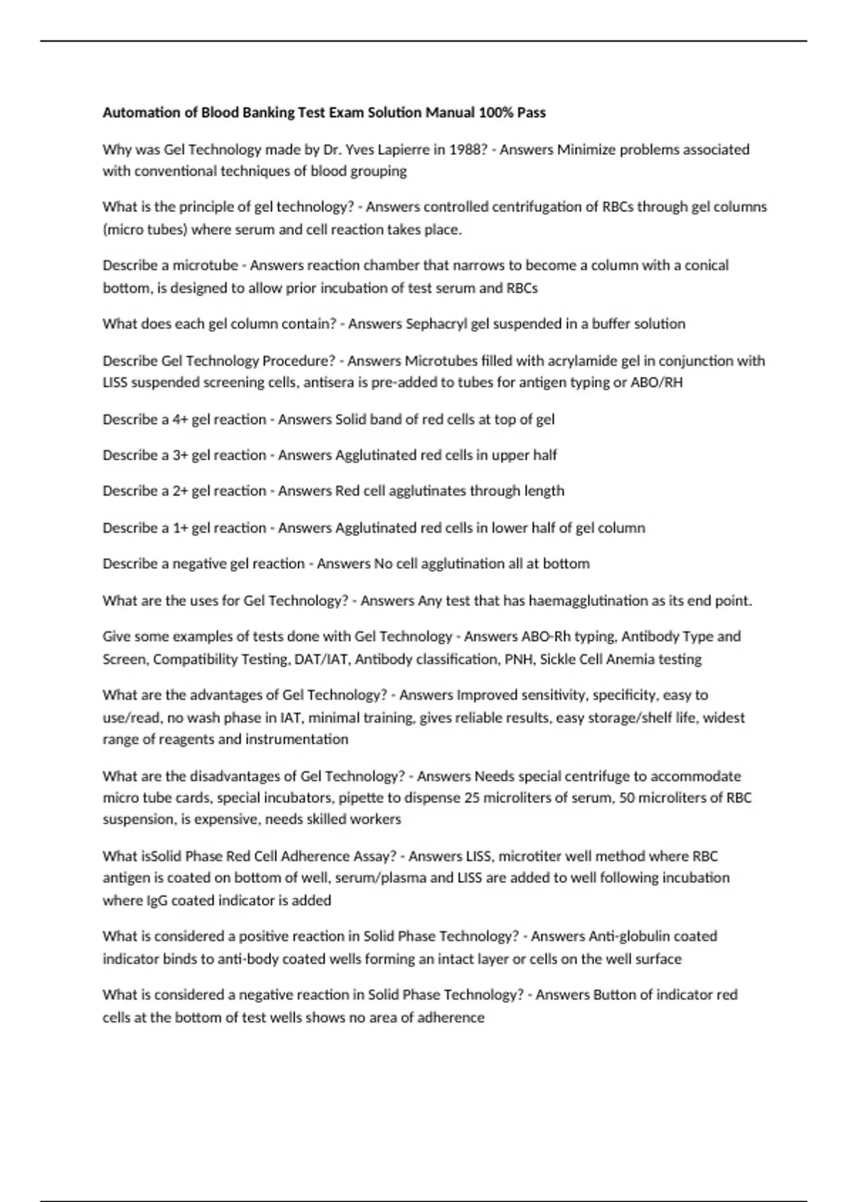 Automation of Blood Banking Test Exam Solution Manual 100% Pass Why was Gel Technology made by Dr. Yves Lapierre in 1988? - Answers Minimize problems associated with conventional techniques of blood grouping What is the principle of gel technology? - Answers controlled centrifugation of RBCs through gel columns (micro tubes) where serum and cell reaction takes place. Describe a microtube - Answers reaction chamber that narrows to become a column with a conical bottom, is designed to allow prior incubation of test serum and RBCs What does each gel column contain? - Answers Sephacryl gel suspended in a buffer solution Describe Gel Technology Procedure? - Answers Microtubes filled with acrylamide gel in conjunction with LISS suspended screening cells, antisera is pre-added to tubes for antigen typing or ABO/RH Describe a 4+ gel reaction - Answers Solid band of red cells at top of gel Describe a 3+ gel reaction - Answers Agglutinated red cells in upper half Describe a 2+ gel reaction - Answers Red cell agglutinates through length Describe a 1+ gel reaction - Answers Agglutinated red cells in lower half of gel column Describe a negative gel reaction - Answers No cell agglutination all at bottom What are the uses for Gel Technology? - Answers Any test that has haemagglutination as its end point. Give some examples of tests done with Gel Technology - Answers ABO-Rh typing, Antibody Type and Screen, Compatibility Testing, DAT/IAT, Antibody classification, PNH, Sickle Cell Anemia testing What are the advantages of Gel Technology? - Answers Improved sensitivity, specificity, easy to use/read, no wash phase in IAT, minimal training, gives reliable results, easy storage/shelf life, widest range of reagents and instrumentation