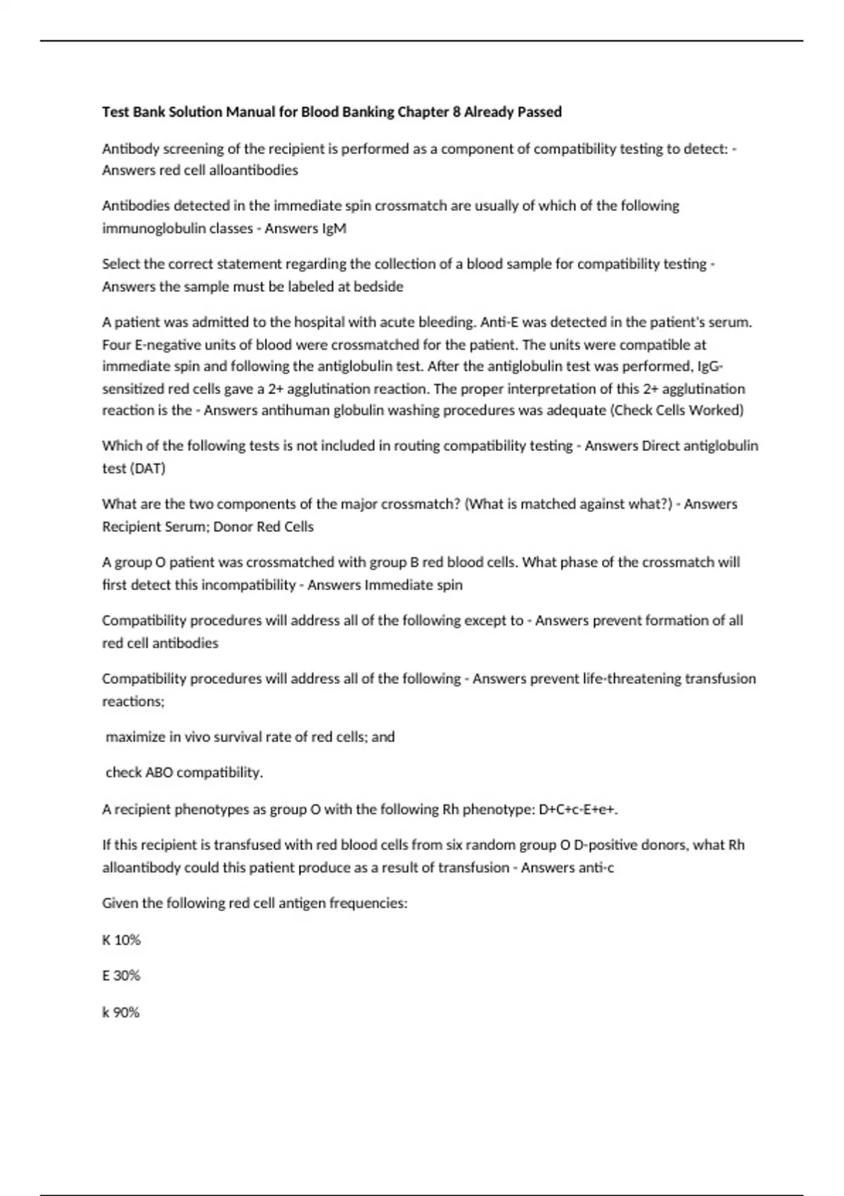 Test Bank Solution Manual for Blood Banking Chapter 8 Already Passed Antibody screening of the recipient is performed as a component of compatibility testing to detect: - Answers red cell alloantibodies Antibodies detected in the immediate spin crossmatch are usually of which of the following immunoglobulin classes - Answers IgM Select the correct statement regarding the collection of a blood sample for compatibility testing - Answers the sample must be labeled at bedside A patient was admitted to the hospital with acute bleeding. Anti-E was detected in the patient's serum. Four E-negative units of blood were crossmatched for the patient. The units were compatible at immediate spin and following the antiglobulin test. After the antiglobulin test was performed, IgG-sensitized red cells gave a 2+ agglutination reaction. The proper interpretation of this 2+ agglutination reaction is the - Answers antihuman globulin washing procedures was adequate (Check Cells Worked) Which of the following tests is not included in routing compatibility testing - Answers Direct antiglobulin test (DAT) What are the two components of the major crossmatch? (What is matched against what?) - Answers Recipient Serum; Donor Red Cells A group O patient was crossmatched with group B red blood cells. What phase of the crossmatch will first detect this incompatibility - Answers Immediate spin Compatibility procedures will address all of the following except to - Answers prevent formation of all red cell antibodies Compatibility procedures will address all of the following - Answers prevent life-threatening transfusion reactions; maximize in vivo survival rate of red cells; and check ABO compatibility. A recipient phenotypes as group O with the following Rh phenotype: D+C+c-E+e+. If this recipient is transfused with red blood cells from six random group O D-positive donors, what Rh alloantibody could this patient produce as a result of transfusion - Answers anti-c Given the following red cell antigen frequencies: K 10% E 30%
