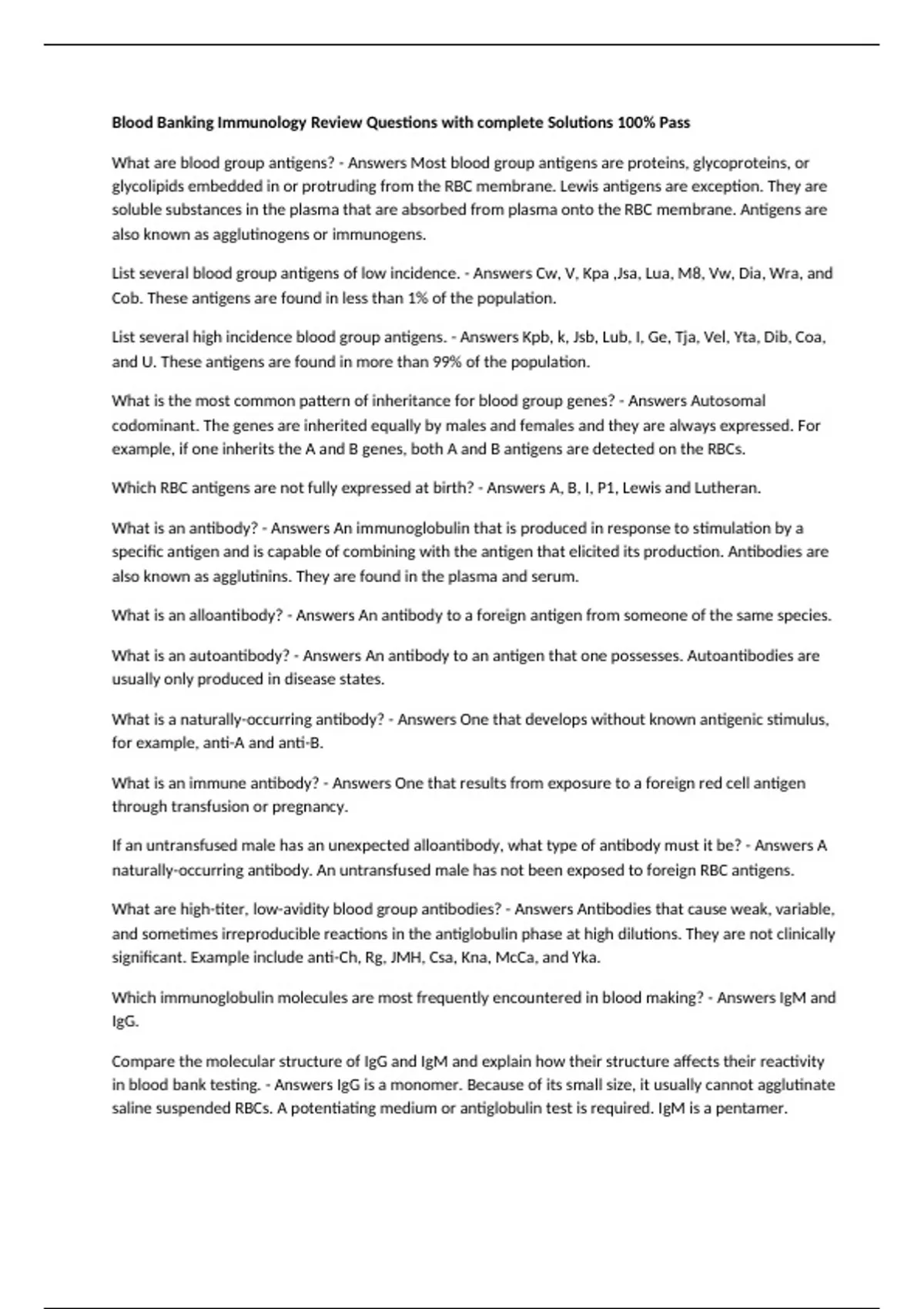 Blood Banking Immunology Review Questions with complete Solutions 100% Pass What are blood group antigens? - Answers Most blood group antigens are proteins, glycoproteins, or glycolipids embedded in or protruding from the RBC membrane. Lewis antigens are exception. They are soluble substances in the plasma that are absorbed from plasma onto the RBC membrane. Antigens are also known as agglutinogens or immunogens. List several blood group antigens of low incidence. - Answers Cw, V, Kpa ,Jsa, Lua, M8, Vw, Dia, Wra, and Cob. These antigens are found in less than 1% of the population. List several high incidence blood group antigens. - Answers Kpb, k, Jsb, Lub, I, Ge, Tja, Vel, Yta, Dib, Coa, and U. These antigens are found in more than 99% of the population. What is the most common pattern of inheritance for blood group genes? - Answers Autosomal codominant. The genes are inherited equally by males and females and they are always expressed. For example, if one inherits the A and B genes, both A and B antigens are detected on the RBCs. Which RBC antigens are not fully expressed at birth? - Answers A, B, I, P1, Lewis and Lutheran. What is an antibody? - Answers An immunoglobulin that is produced in response to stimulation by a specific antigen and is capable of combining with the antigen that elicited its production. Antibodies are also known as agglutinins. They are found in the plasma and serum. What is an alloantibody? - Answers An antibody to a foreign antigen from someone of the same species. What is an autoantibody? - Answers An antibody to an antigen that one possesses. Autoantibodies are usually only produced in disease states. What is a naturally-occurring antibody? - Answers One that develops without known antigenic stimulus, for example, anti-A and anti-B. What is an immune antibody? - Answers One that results from exposure to a foreign red cell antigen through transfusion or pregnancy. If an untransfused male has an unexpected alloantibody, what type of antibody must it be? - Answers A naturally-occurring antibody. An untransfused male has not been exposed to foreign RBC antigens. What are high-titer, low-avidity blood group antibodies? - Answers Antibodies that cause weak, variable, and sometimes irreproducible reactions in the antiglobulin phase at high dilutions. They are not clinically significant. Example include anti-Ch, Rg, JMH, Csa, Kna, McCa, and Yka. Which immunoglobulin molecules are most frequently encountered in blood making? - Answers IgM and IgG. Compare the molecular structure of IgG and IgM and explain how their structure affects their reactivity in blood bank testing. - Answers IgG is a monomer. Because of its small size, it usually cannot agglutinate saline suspended RBCs. A potentiating medium or antiglobulin test is required. IgM is a pentamer. Because of its large size, it is a potent agglutinator, even of saline-suspended cells at room temperature, and it is an efficient activator of complement. Which class of immunoglobulins is destroyed by sulfhydryl compounds like 2-mercaptoethanol or dithiothreitol? - Answers IgM. These compounds break the J chains that hold IgM together. Which immunoglobulin class is most efficient at activating complement? - Answers IgM. Which immunoglobulin class can cross the placenta? - Answers IgG. What is sensitization? - Answers The attachment of antibodies to antigens on a red cell. List several factors that affect hemagglutination. - Answers The sensitization phase is affected by the temperature, the pH, the ionic strength of the medium, the antigen-antibody ratio, and the time of incubation. The agglutination phase is affected by the type of antibody, the density and location of antigens, and the zeta potential (electrostatic repulsion_. What are some potentiators that are used to enhance antigens-antibody reactions? - Answers 22% albumin, low ionic strength salt solution (LISS), and polyethylene glycol (PEG). What is the advantage of using LISS? - Answers It increases the rate at which an antibody binds to red cell antigens so the incubation time can be shortened to 10 minutes. What are two visible signs of antigen-antibody reaction in blood bank testing? - Answers Agglutinations and hemolysis. What causes hemolysis? - Answers The complement terminal membrane attack unit, C5b, C6, C7, C8, and C9. This unit embeds in the cell membrane and forms a hole. The loss of membrane integrity and the change in osmotic pressure within the cell leads to cell death and lysis. Explain the correct way to examine a tube for signs of an antigen-antibody reaction. - Answers Following centrifugation, the tube should be gently shaken or tilted until the cell button is completely dispersed. The manner in which cells come off the button should be observed. An optical aid, such as an agglutination viewer with a light and a magnifying mirror, should be used. In tube testing, how would three large agglutinates against a clear background be graded? - Answers 3+. In blood bank records, what must be recorded in addition to the degree of reactivity in all phase of testing? - Answers The interpretation of the reactions, the identity of the person who performed the tests, and the date of testing. Timely supervisor review is required. Why should serum separator tubes not be used in blood bank testing? - Answers The gel can