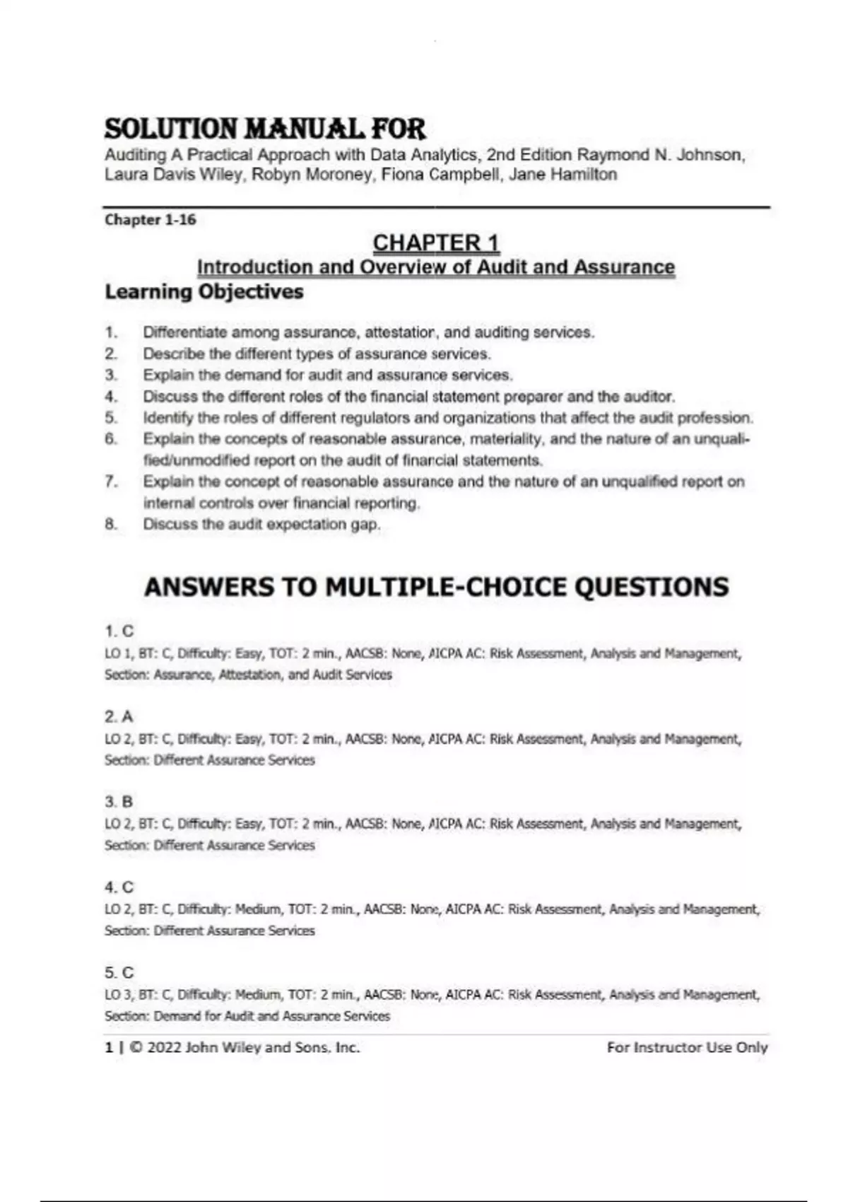 Solution Manual For Auditing A Practical Approach with Data Analytics, 2nd Edition Raymond N CHAPTER 1 Introduction and Overview of Audit and Assurance Learning Objectives 1. Differentiate among assurance, attestation, and auditing services. 2. Describe the different types of assurance services. 3. Explain the demand for audit and assurance services. 4. Discuss the different roles of the financial statement preparer and the auditor. 5. Identify the roles of different regulators and organizations that affect the audit profession. 6. Explain the concepts of reasonable assurance, materiality, and the nature of an unqualified/unmodified report on the audit of financial statements. 7. Explain the concept of reasonable assurance and the nature of an unqualified report on internal controls over financial reporting. 8. Discuss the audit expectation gap. ANSWERS TO MULTIPLE-CHOICE QUESTIONS 1. C LO 1, BT: C, Difficulty: Easy, TOT: 2 min., AACSB: None, AICPA AC: Risk Assessment, Analysis and Management, Section: Assurance, Attestation, and Audit Services