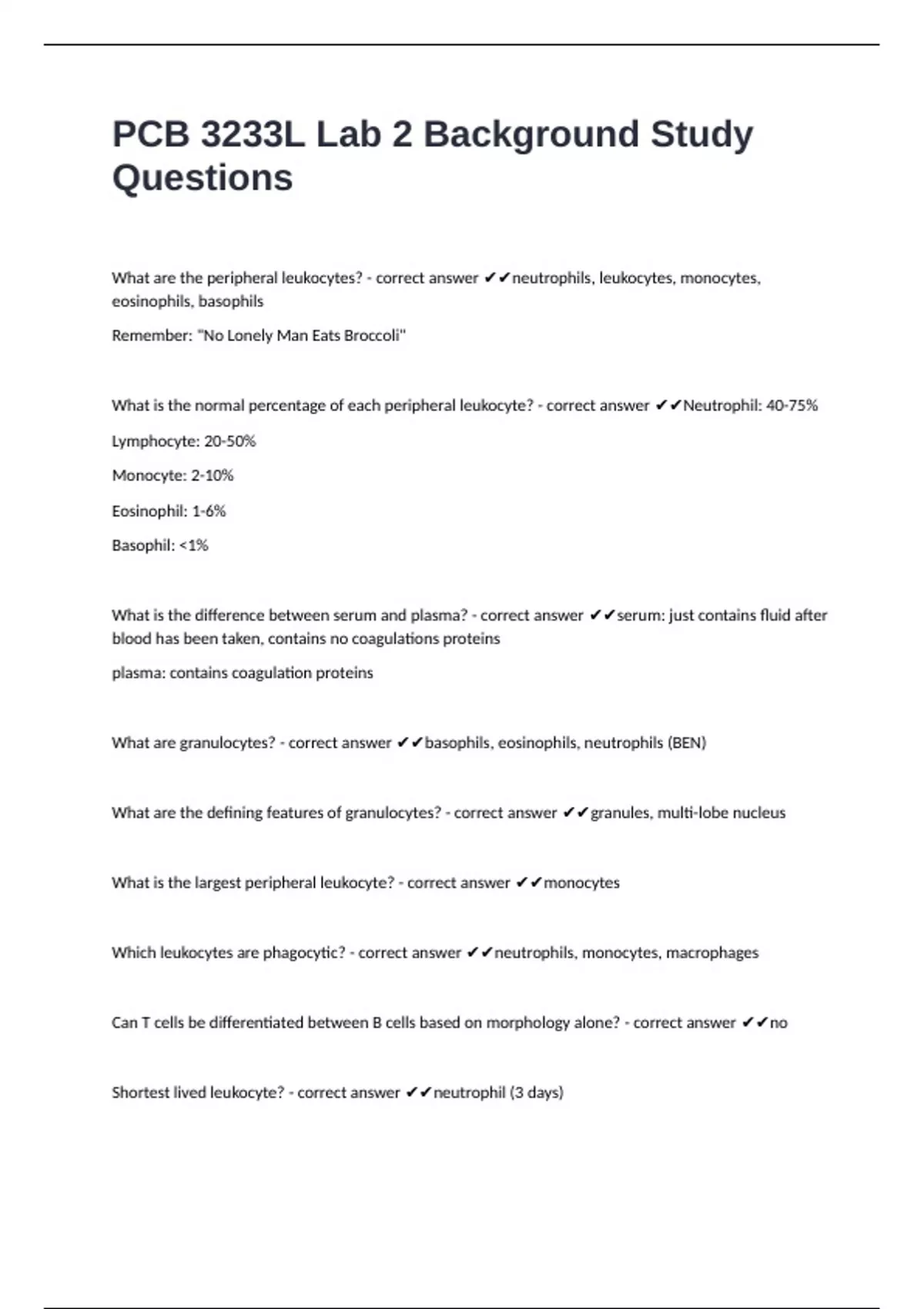 What are granulocytes? - correct answer ✔✔basophils, eosinophils, neutrophils (BEN)