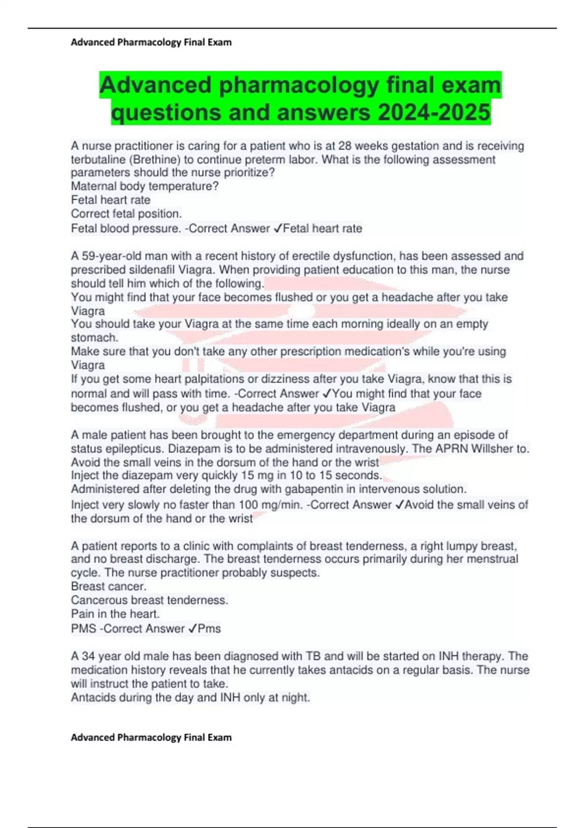 A nurse practitioner is caring for a patient who is at 28 weeks gestation and is receiving terbutaline (Brethine) to continue preterm labor. What is the following assessment parameters should the nurse prioritize? Maternal body temperature? Fetal heart rate Correct fetal position. Fetal blood pressure. -Correct Answer Fetal heart rate A 59-year-old man with a recent history of erectile dysfunction, has been assessed and prescribed sildenafil Viagra. When providing patient education to this man, the nurse should tell him which of the following. You might find that your face becomes flushed or you get a headache after you take Viagra You should take your Viagra at the same time each morning ideally on an empty stomach. Make sure that you don't take any other prescription medication's while you're using Viagra If you get some heart palpitations or dizziness after you take Viagra, know that this is normal and will pass with time. -Correct Answer You might find that your face becomes flushed, or you get a headache after you take Viagra A male patient has been brought to the emergency department during an episode of status epilepticus. Diazepam is to be administered intravenously. The APRN Willsher to. Avoid the small veins in the dorsum of the hand or the wrist Inject the diazepam very quickly 15 mg in 10 to 15 seconds. Administered after deleting the drug with gabapentin in intervenous solution. Inject very slowly no faster than 100 mg/min. -Correct Answer Avoid the small veins of the dorsum of the hand or the wrist A patient reports to a clinic with complaints of breast tenderness, a right lumpy breast, and no breast discharge. The breast tenderness occurs primarily during her menstrual cycle. The nurse practitioner probably suspects. Breast cancer. Cancerous breast tenderness. Pain in the heart. PMS -Correct Answer Pms A 34 year old male has been diagnosed with TB and will be started on INH therapy. The medication history reveals that he currently takes antacids on a regular basis. The nurse will instruct the patient to take. Antacids during the day and INH only at night. Antacids before meals and INH one to two hours after meals. INH before meals and antiacids one to two hours after meals. Antacids not less than one hour before or two hours after taking INH -Correct Answer Antacids, not less than one hour before or two hours after taking INH Alendronate Fosamax is prescribed for a 67-year-old post menopausal woman. In order to help prevent gastrointestinal distress, the nurse will advise the patient two Stand or sit upright for at least 30 minutes after taking Allen donate. Avoid drinking water with the drug Lift weights in the gym at least five times a week. Take calcium and vitamin D supplements. -Correct Answer Stand up or sit upright for at least 30 minutes after taking Alendronate Morphine has been prescribed for a 28 year old man with severe pain due to a back injury. The nurse will advise the patient to avoid. Alcohol. Vitamin C Fatty foods Dairy products. -Correct Answer Alcohol A child is taking permethrin for head lice. The nurse practitioner will instruct her mother two Wash your hair daily with a good shampoo. Increase your daily intake of milk. Maximize the child's fluid intake. Stop using creams, ornaments, and oils on the childs skin and scalp. -Correct Answer Stop using creams, ornaments, and oils on the child skin and scalp A patient is taking flavoxate hydrochloride your response to help control an overactive bladder. On a follow up visit to the clinic, the nurse will question the patient about which of the following? Chronic diarrhea. Dental hygiene practices. Headaches Diet -Correct Answer Dental hygiene practices A patient has been prescribed oral tetracycline. The nurse will instruct the patient to take the drug. On an empty stomach one hour before or two hours after taking any meals or other drugs With a meal With milk or fruit juice At that time only. -Correct Answer On an empty stomach, one hour before or two hours after taking any meals or other drugs