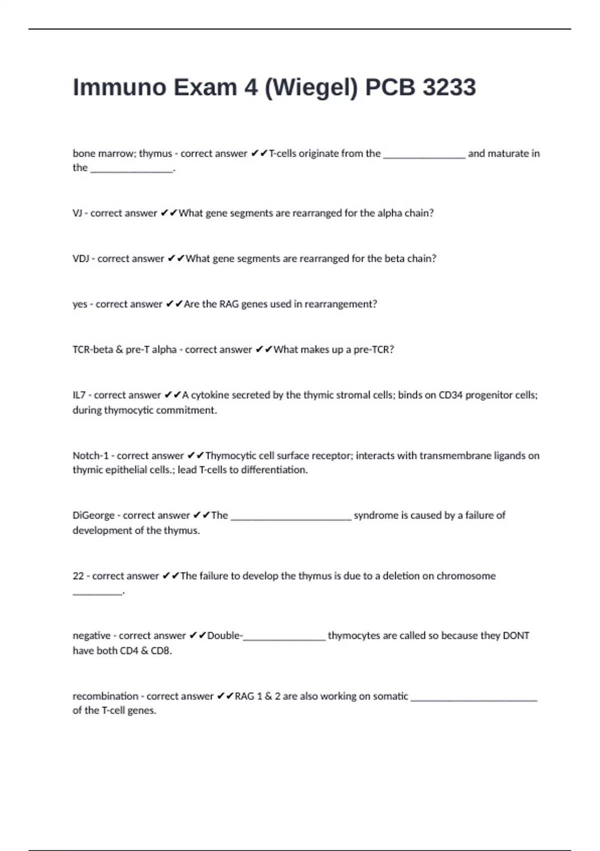 Pre T Cell - correct answer ✔✔____________________ Receptor: β chain is made before γ:δ receptor