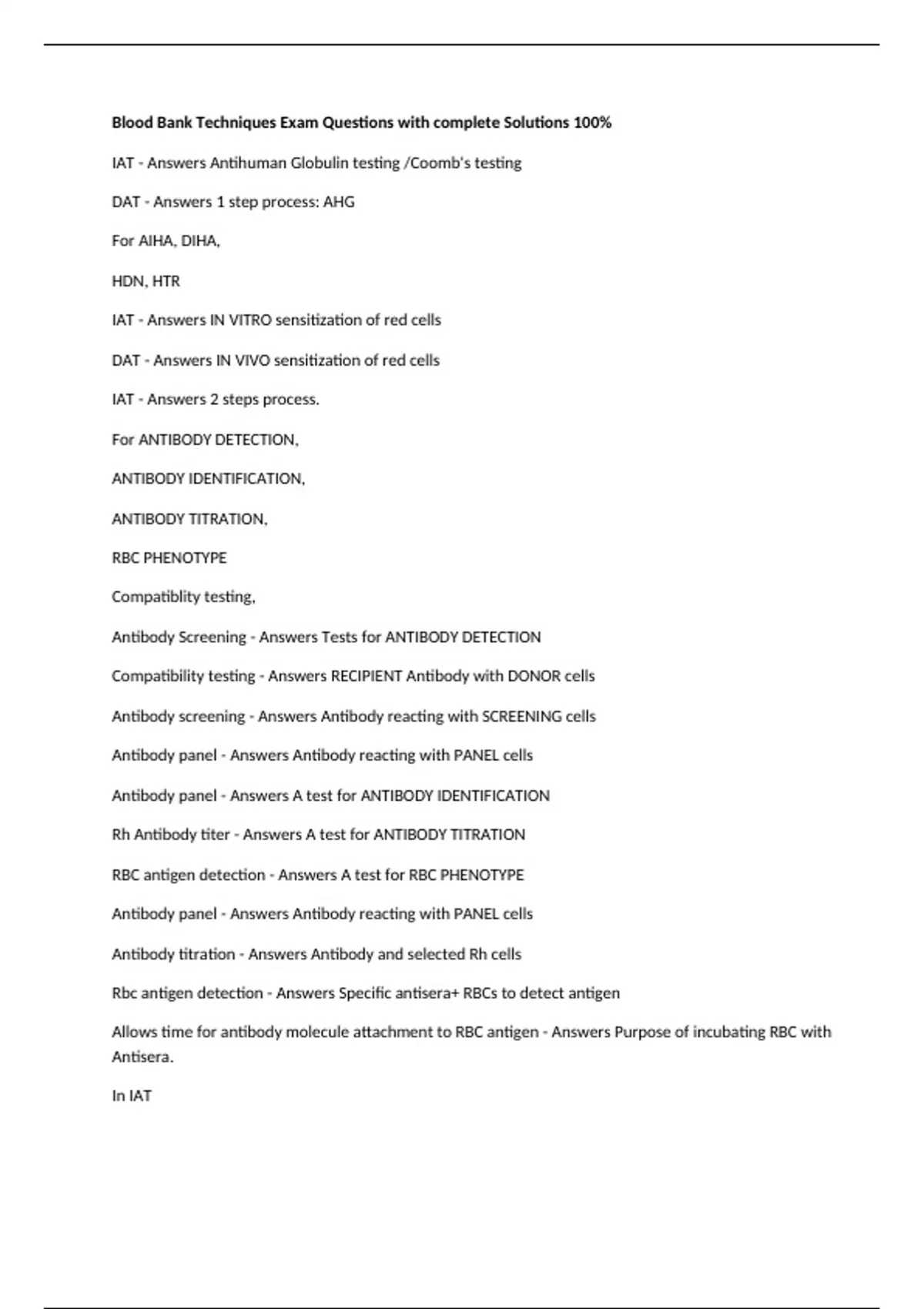 Blood Bank Techniques Exam Questions with complete Solutions 100% IAT - Answers Antihuman Globulin testing /Coomb's testing DAT - Answers 1 step process: AHG For AIHA, DIHA, HDN, HTR IAT - Answers IN VITRO sensitization of red cells DAT - Answers IN VIVO sensitization of red cells IAT - Answers 2 steps process. For ANTIBODY DETECTION, ANTIBODY IDENTIFICATION, ANTIBODY TITRATION, RBC PHENOTYPE Compatiblity testing, Antibody Screening - Answers Tests for ANTIBODY DETECTION Compatibility testing - Answers RECIPIENT Antibody with DONOR cells Antibody screening - Answers Antibody reacting with SCREENING cells Antibody panel - Answers Antibody reacting with PANEL cells Antibody panel - Answers A test for ANTIBODY IDENTIFICATION Rh Antibody titer - Answers A test for ANTIBODY TITRATION RBC antigen detection - Answers A test for RBC PHENOTYPE Antibody panel - Answers Antibody reacting with PANEL cells Antibody titration - Answers Antibody and selected Rh cells Rbc antigen detection - Answers Specific antisera+ RBCs to detect antigen Allows time for antibody molecule attachment to RBC antigen - Answers Purpose of incubating RBC with Antisera. In IAT Removes free globulin molecules - Answers Purpose of performing minimum of 3 saline machine To form RBC Agglutinate - Answers Purpose of adding AHG REAGENT Centrifuge - Answers Acceletrates agglutination by BRINGING CELLS TOGETHER Positive Negative - Answers In IAT, if there is agglutination interpret as To determine the strength of reaction - Answers Why do you need to GRADE AGGLUTINATION REACTION Check cells - Answers CHECKS for NEUTRALIZATION of ANTISERA by free globulin molecules. Check cells - Answers IgG sensitized RBC, (+) agglutination (-) invalid 40:1 - Answers Serum to cell ratio 133:1 - Answers Serum to cell ratio when detecting weak Antibodies Adding 2 drops serum 1 drop 5% RCS - Answers Achieve 40:1 minimum ratio by Adding 4 drops serum 1 drop % RCS - Answers Achieve 133:1 ratio in weak antibody detection Albumin LISS PEG - Answers Reaction medium in AHG test Albumin - Answers A reaction medium that allow antibody coated cells to come into closer to each other LISS - Answers Increase antibody uptake, allow incubation time to decrease from 30-60 mins to 10-15 mins by reducing ZETA POTENTIAL. Zeta potential - Answers Reduces incubation time in LISS PEG - Answers Water soluble linear polymer used as an additive to increase Antibody uptake by REMOVING WATER MOLECULES surrounding the RBC thereby concentrating the antibody ABO RH typing Antibody screening Crossmatch - Answers Compatibility tesitng for HOMOLOGOUS transfusion Unexpected antibodies - Answers Screening of the donor's and recipient serum for___ ABO Rh typing Antibody screening - Answers Compatibility testing for AUTOLOGOUS transfusion Autologous transfusion Neonatal transfusion - Answers Crossmatch NOT required O- - Answers In cases of EMERGENCY. What blood should be given Transfuse 8-10 units in less than 24 hours or 4-5 units in 1 hour - Answers Massive transfusion Crossmatch - Answers Final check of ABO compatibility. May detect presence of antibody in patient's serum that will react with antigens on donor's RBC that was Not detected in antibody screening Immediate spin crossmatch - Answers Mix PSDR and centrifuge immediately. NO clinical significant unexpected antibodies detected and NO previous record of antibodies Type and screen - Answers Testing patient blood sample for ABO, Rh. Clinically significant unexpected antibodies. Patient sample then stored in BB ref for future crossmatch if blood is needed for transfusion. Abbreviated crossmatch - Answers Immediate spin + type and screen Antiglobulin crossmatch - Answers A crossmatch that Begins the sane manner as immediate spin crossmatch. Continue at 37C incubation, Finishes with antiglobulin test Computer crossmatch - Answers Compares Recent ABO results on file for bothdonor and recipient Computer crossmatch - Answers Can only be used for purpose of detecting ABO incompatibility Blood spectrum compatibility test - Answers Method of choice for crossmatch
